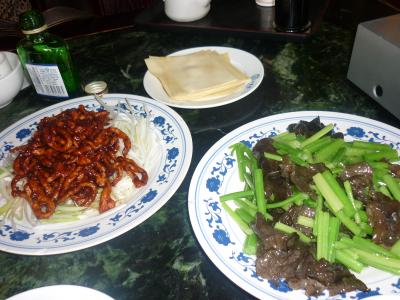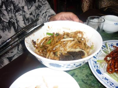 ここのおすすめのジャージャー麺は素朴でおいしいです。麺が小麦の味がしてしこしこしています。そこにもやし・きゅうり・人参の茹で野菜と甘めの味噌を入れて混ぜ混ぜしていただきます。連れてきてくれた運転手さんのおすすめの一品の豚肉の味噌炒め(下にねぎの千切りがしいてある)と、青菜ときくらげの炒め物 これもすごくおいしかったです。運転手さんが言うには「日本の人はチンジャオロースが好きみたいだけど、北京ではそれよりこれを頼むね!味噌がうまいし、ねぎと合う」確かにこれがまたおいしい。
