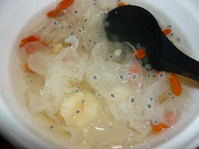 白きくらげ・なつめ・クコなどが薄甘いシロップに入っててアンチエイジングに