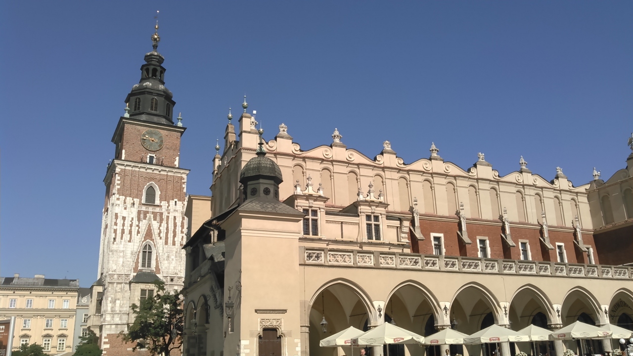 ツアーで訪問しました。中世からそのまま残っている広場としては。ヨーロッパ最大と言われる中央広場にあります。長さが100mもあり、クリーム色が綺麗です。14世紀に建てられ、当時は衣服や布地の交易所だったので、この名が付いたそうです。1階には民芸品や土産物などを売るお店がびっしり並んでいます。