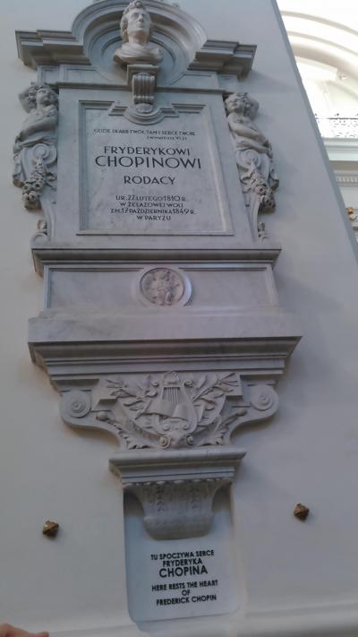 ツアーで訪問しました。ショパンの心臓が安置されていることで有名な、バロック様式の教会です。日曜だったので、ミサの始まる前に見学しました。心臓がそのままみられるのかと思っていたら、全然違い、柱だけ見られました。以前保存状態を調べたら、大丈夫だったので、50年後にまた取り出されるそうです。