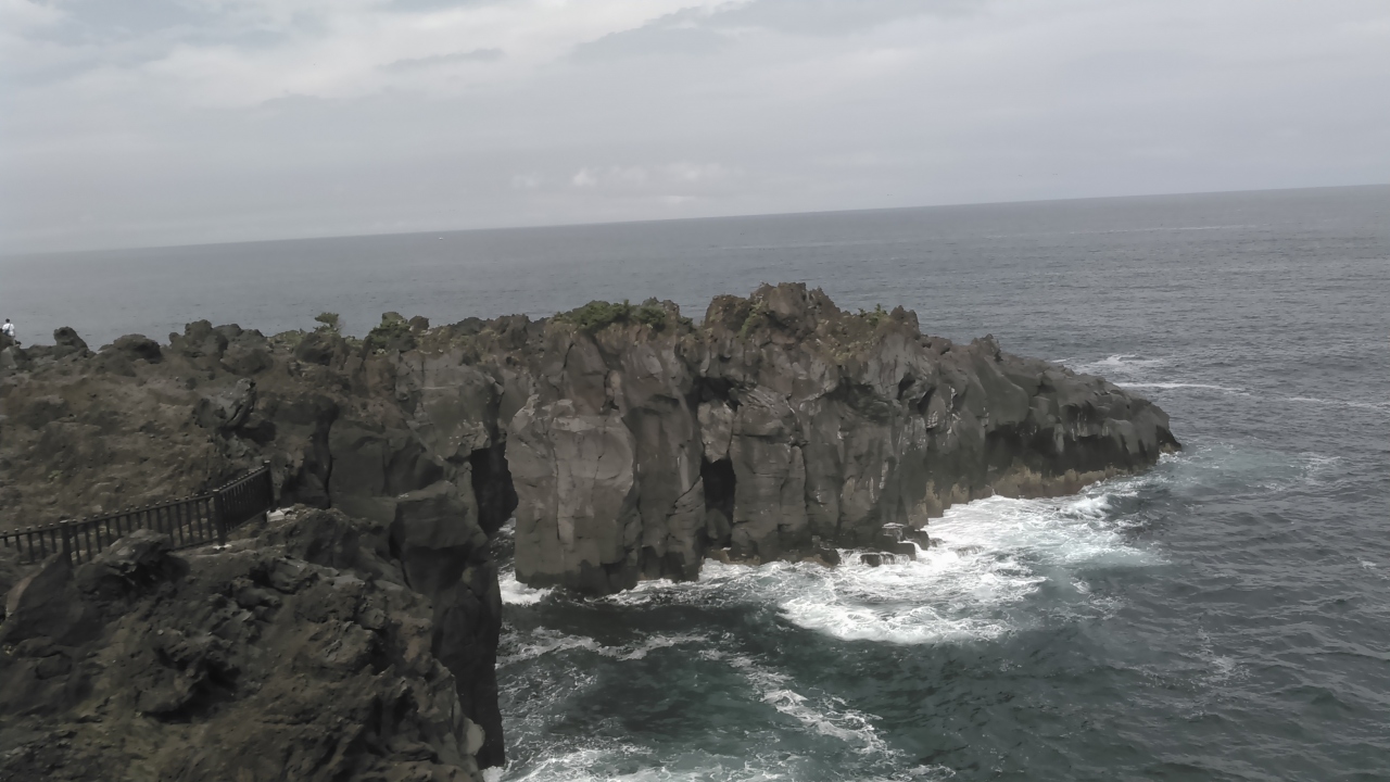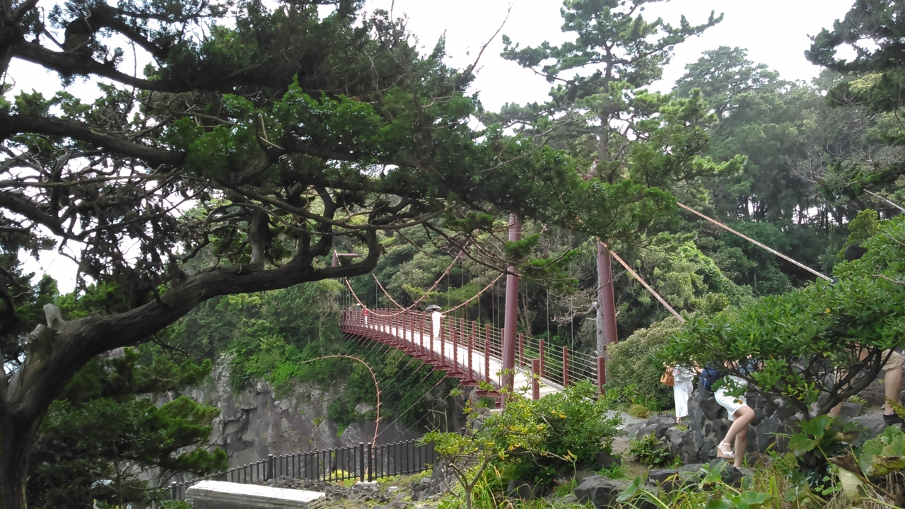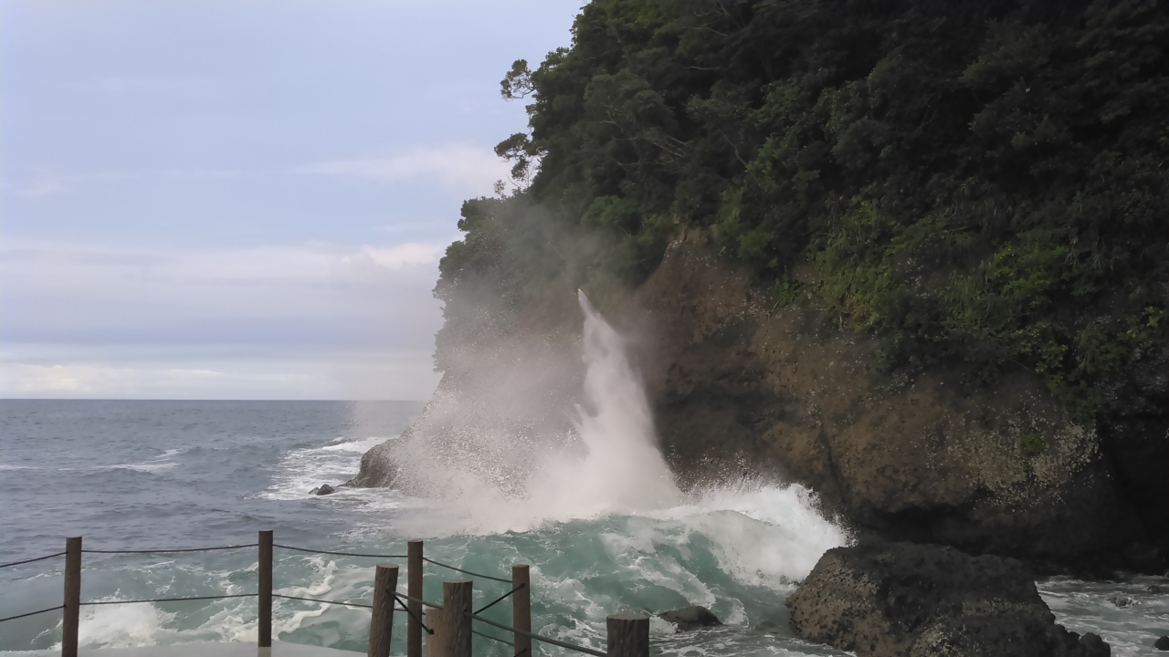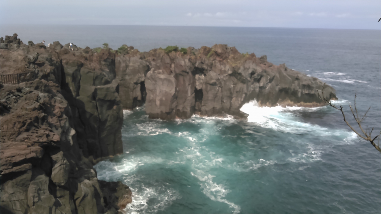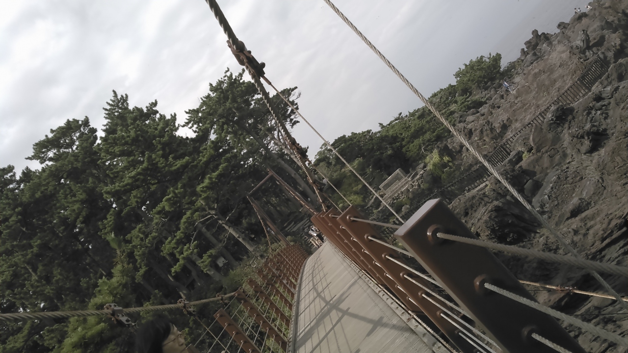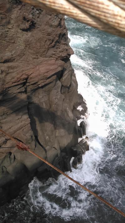普段穏やかな瀬戸内海しか見ていない友達が、太平洋が見たいと言うことで3人で訪問しました。城ケ崎一番の観光スポットです。高所恐怖症のもう一人の友達はしっかり手すりにつかまって歩きました。つり橋は全長48m高さ23mで、柱状節理の直角の岩に打ち寄せる白波は大迫力です。