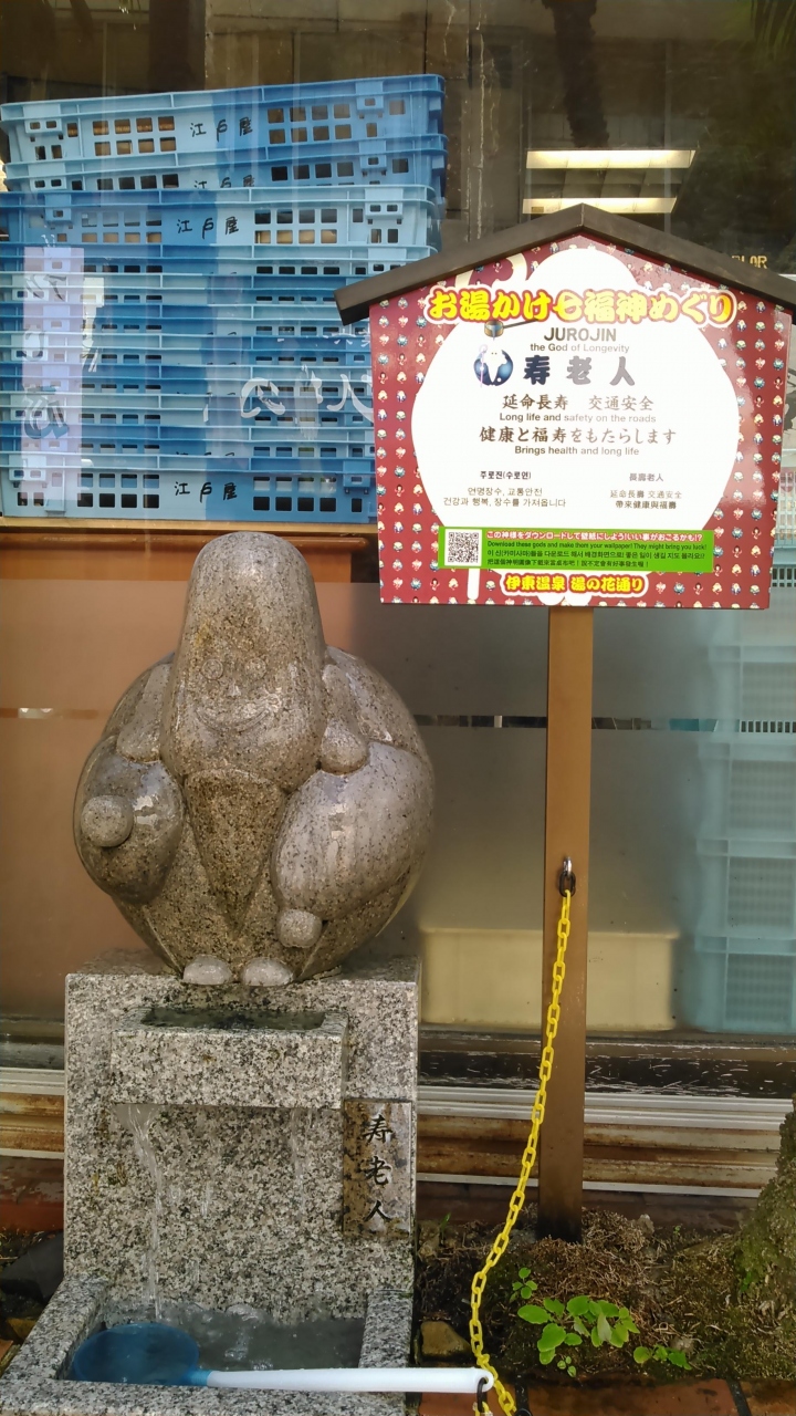 伊東でのランチの後、ぶらぶらと伊東駅に行く途中偶然見つけました。お湯かけ七福神なので、本来なら七人にかけるのでしょうが、時間の制約もあり、見つけた神様だけかけました。交通安全の神様ですから、旅の安全を祈ってかけました。