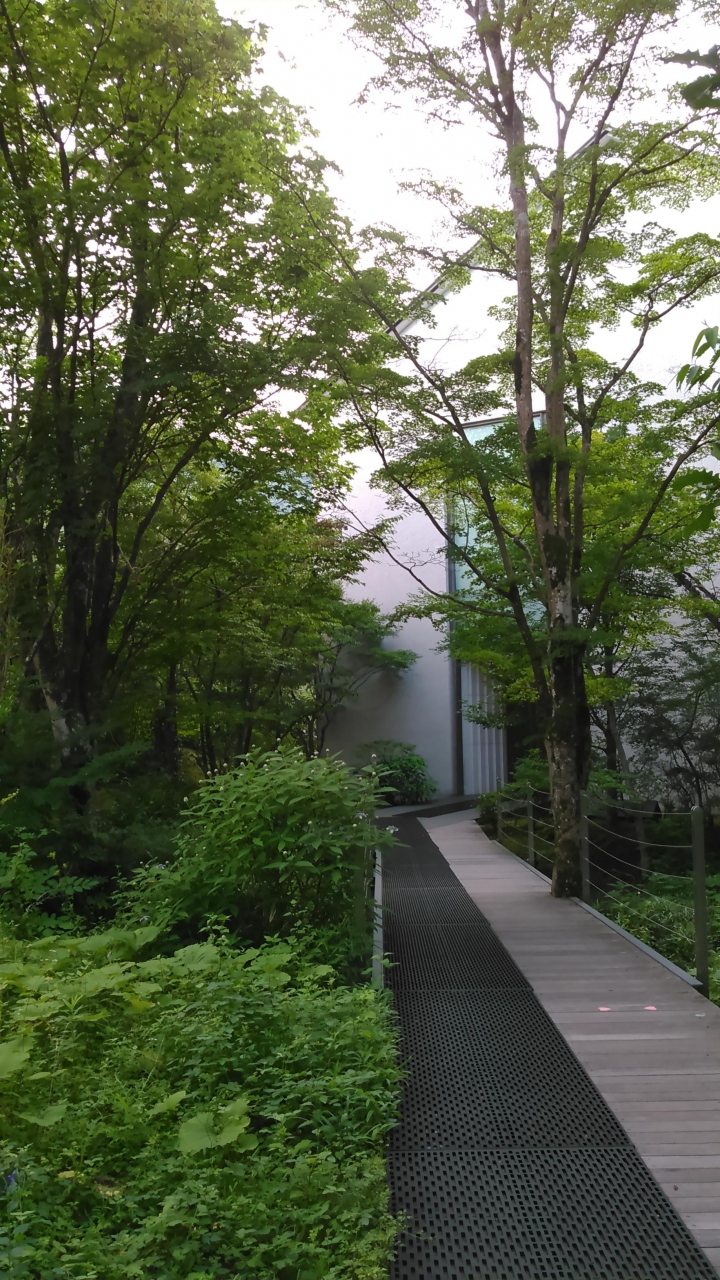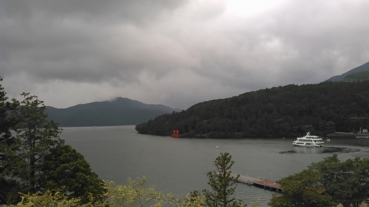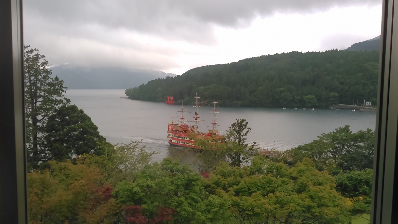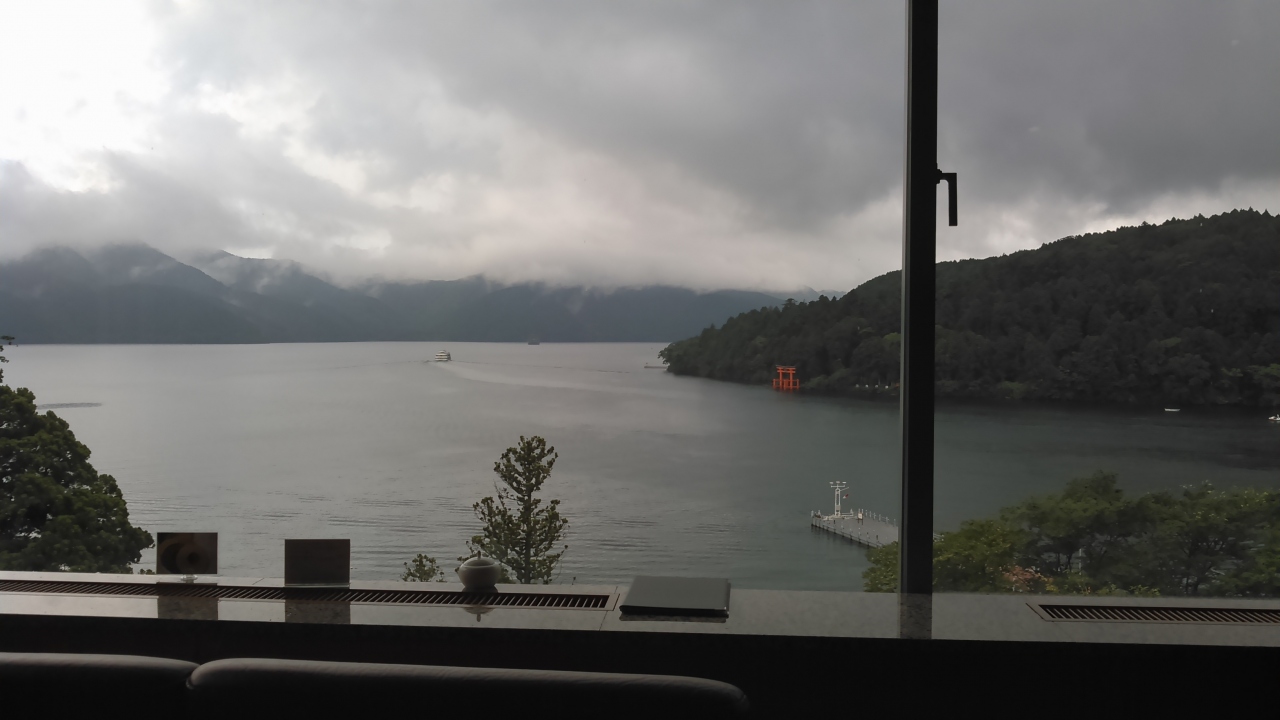 海賊船を元箱根で降りて、ちょっと上を見上げると、すぐわかりました。下からはエスカレーターがあり、入口まで楽です。帰りは坂道を下って徒歩4分。どのガイドブックを見ても「景色が素晴らしい」と書いてありますがその通り。晴れると芦ノ湖と富士山がはっきり見えるようです。残念ながら曇っていました・・・日本画が展示されています。