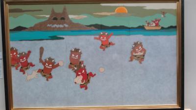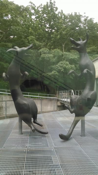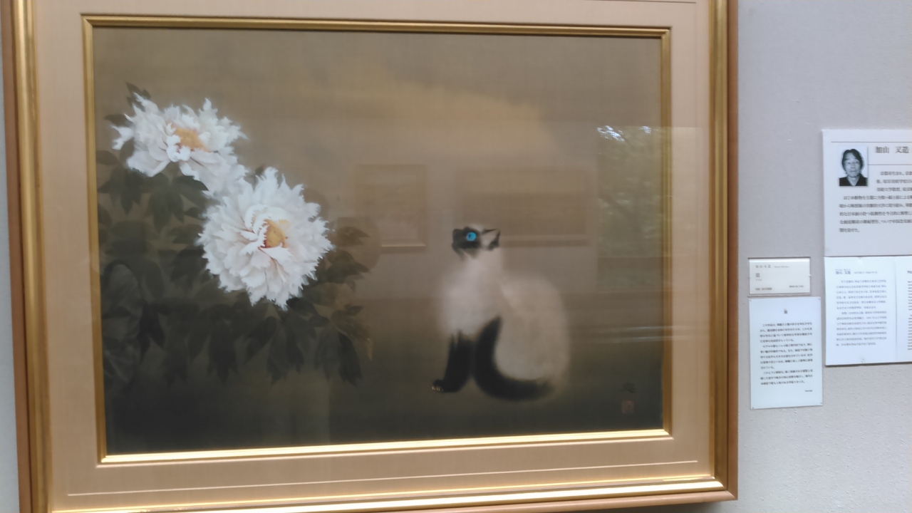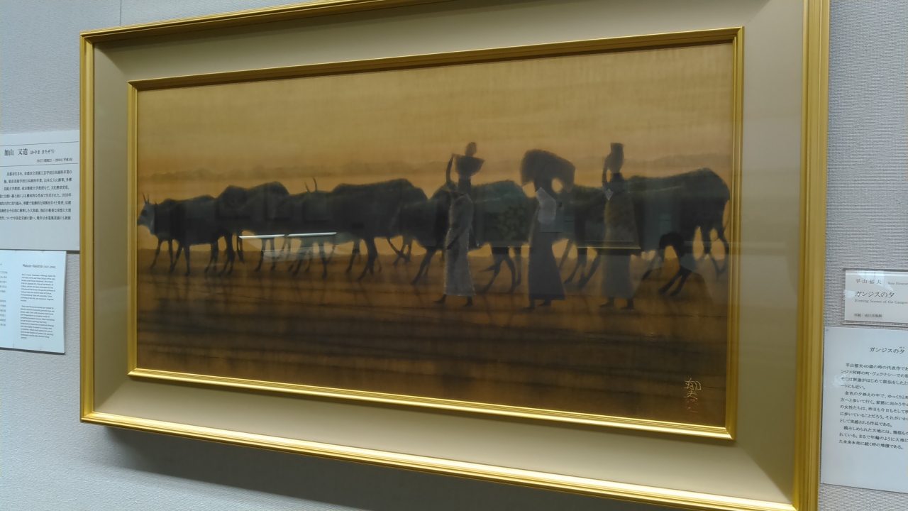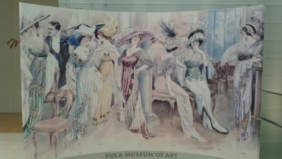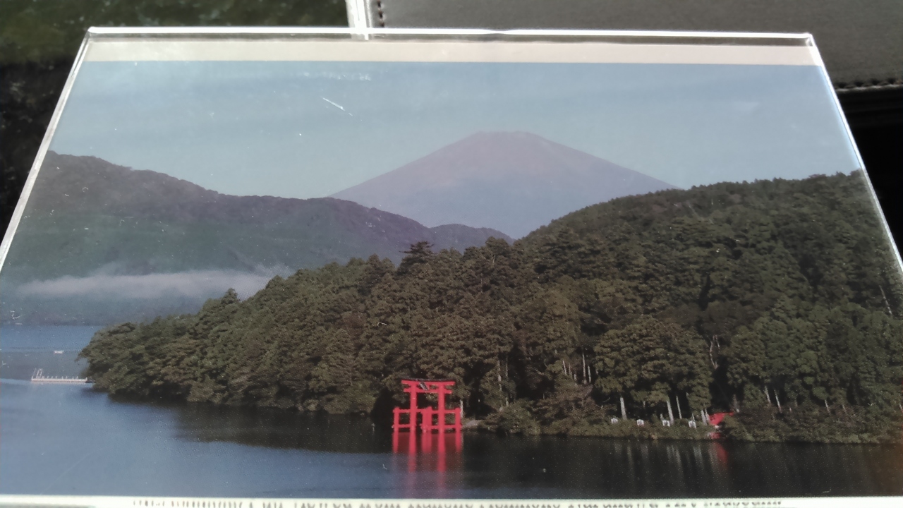 海賊船を元箱根で降りて、ちょっと上を見上げると、すぐわかりました。下からはエスカレーターがあり、入口まで楽です。帰りは坂道を下って徒歩4分。どのガイドブックを見ても「景色が素晴らしい」と書いてありますがその通り。晴れると芦ノ湖と富士山がはっきり見えるようです。残念ながら曇っていました・・・日本画が展示されています。