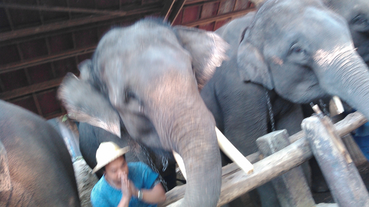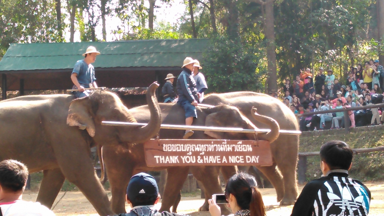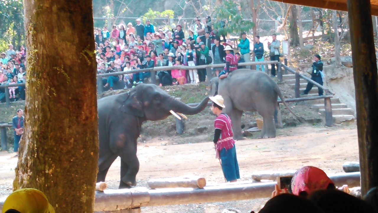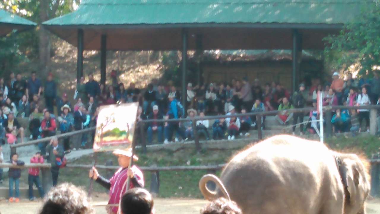 ツアーで訪問しました。寒かったので水浴びはせず、見られませんでした。さとうきび、モンキーバナナ各20Bで、自分の手でえさをやり、その様子を写真に撮ってもらうこともできます。ショーは屋根付きの場所で、座って見られます。丸太を運んだり、サッカーをしたり、絵を描いたりする様子を見ました。上手な風景画で、高いものは1枚8000Bでした。