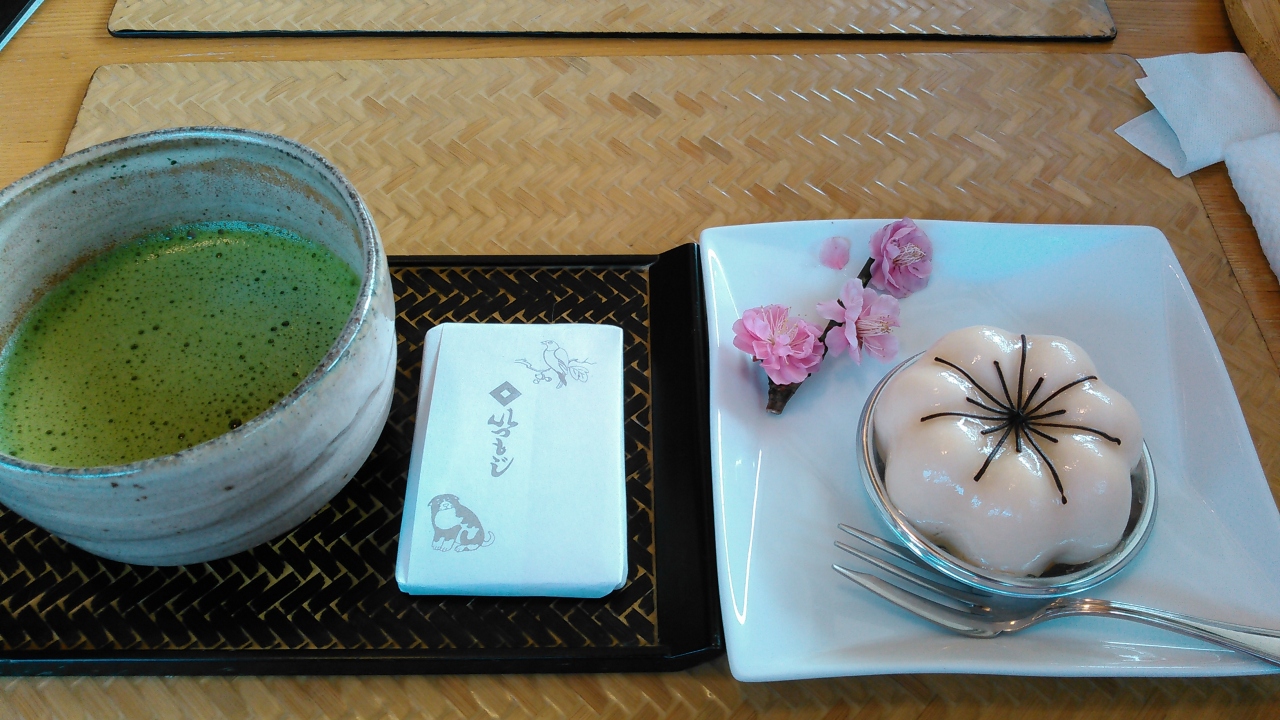 石橋美術館で鑑賞した後には必ず寄ります。庭の花を見て、美術館で鑑賞して、目と心が満足したら、最後はお腹もというのが、私のコースです。今回は「梅定食」を選びました。1100円で、梅ひじきご飯(美味)と、梅干し入り茶わん蒸し(・・・)。焼き魚とゆで卵。食後にアイスと紅茶。食べ足りず、「白梅」という、中が梅ジャム、外側がホワイトチョコレートムースも追加しました。こちらは美味しかったです。