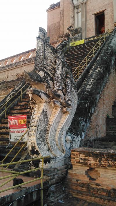 格式ある寺院です。仏塔へ続く階段の入り口で塔を守っているのは3つの頭を持つ蛇神ナーガです。- 旅行時期