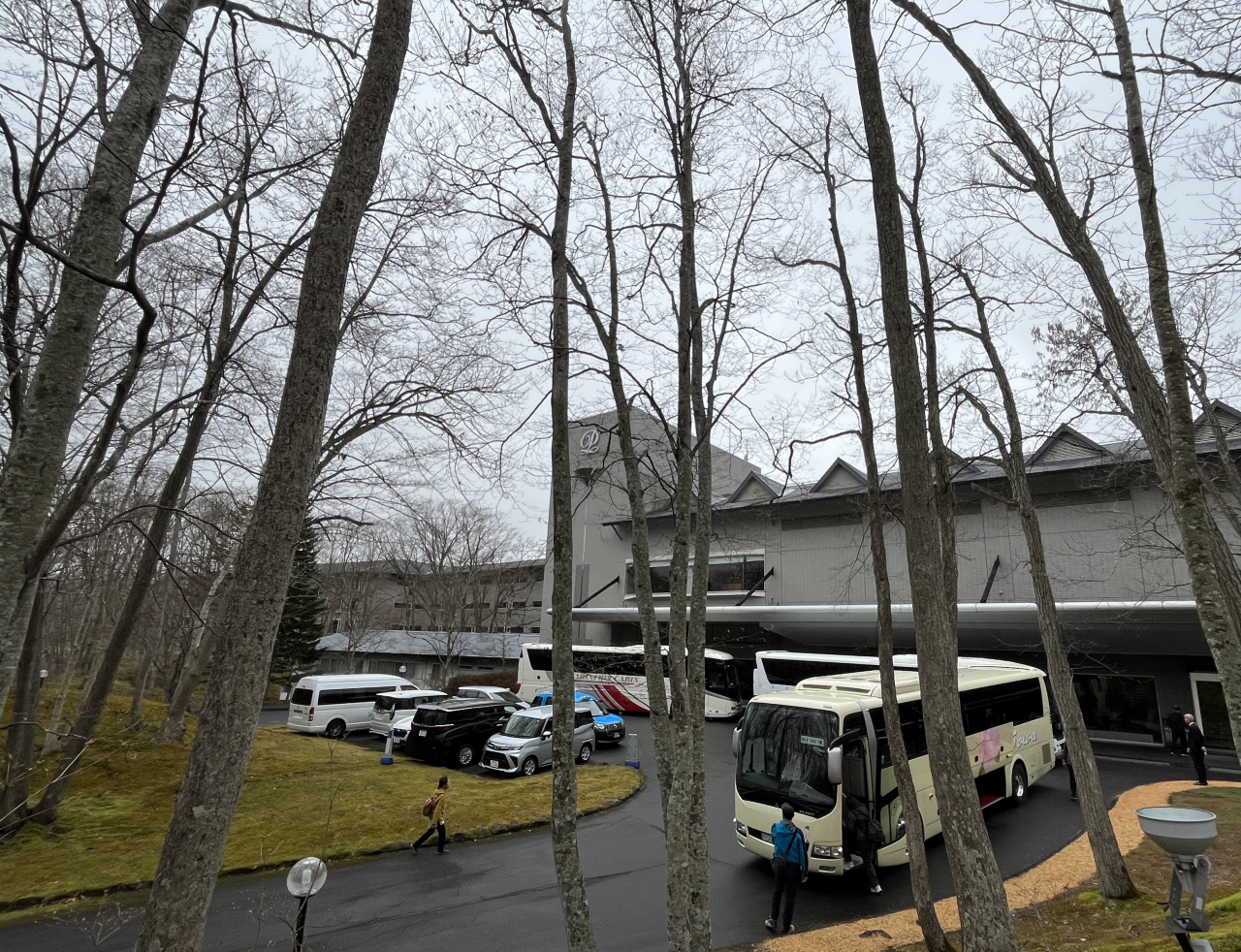 弘前・函館の桜巡りのツアーで2泊しました。大沼国定公園内にあるホテルです。横に長いホテルで、廊下の片側はほとんど窓で、明るいのですが、その分部屋までが遠い。フロントの片側には1101から、1150までが並んでいますが、アサインされたのは1147で、端から3番目。