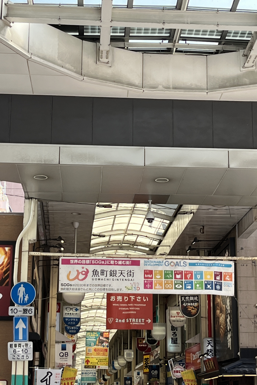 小倉駅から徒歩3分、地元の商店街です。アーケードがあり、雨や太陽を遮ってくれます。ドラッグストア、食堂、喫茶店、金券ショップなどが並んでいます。頭上には川柳を書いた旗が、あちこちに飾ってあります。思わずくすりと笑える物、しみじみ、じわっと来るものなど、いろいろあって、思わず足を止めて眺めてしまいます。