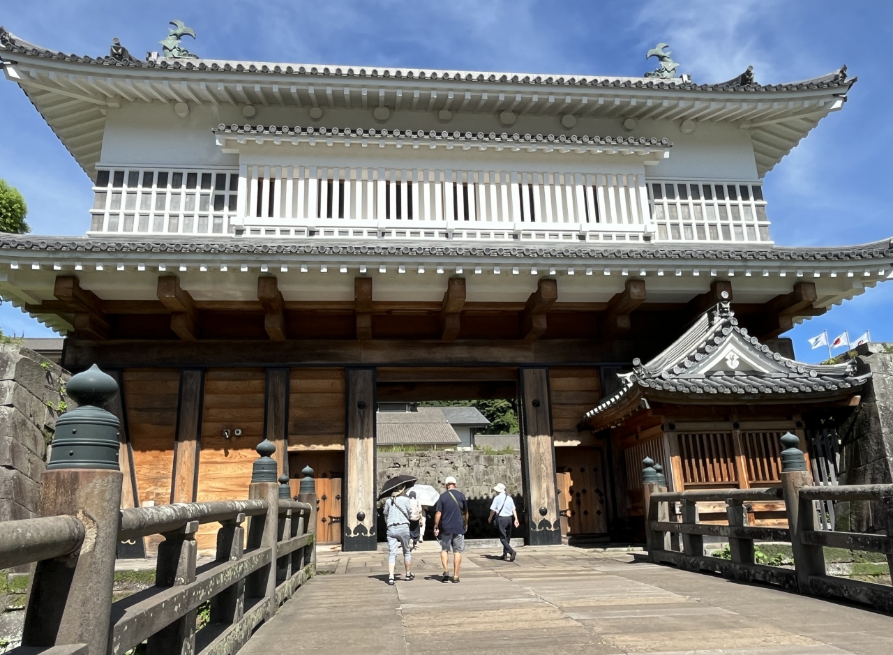 ツアーで訪問しました。御楼門は2020年3月に再建されたものなので、新しく白壁がきれいな門です。お堀には蓮の花が咲きこれも綺麗です。再建した門の下を歩きました。黎明館にはこの門を通っていきます。天璋院篤姫の像もあります。