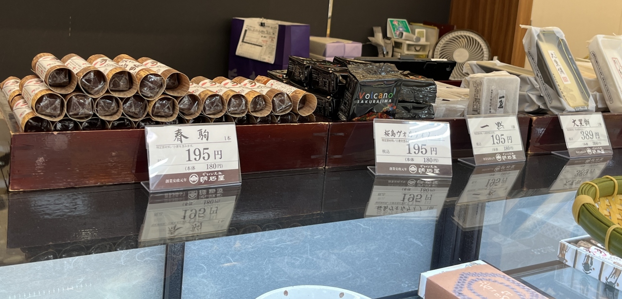 ツアーで鹿児島に来て、現地在住の添乗員のお勧めがこの「明石屋のかるかん」。山芋の含有量が違うそうで、ちょっとお高めだけれど美味しいと。最後、空港で搭乗前に買いに行きましたが、夕方だったせいか、売り切れ。ばら売りもなし。そんなに人気なのかと驚きました。それで「春駒」を買いました。羊羹と外郎を対して2で割ったもので、美味しいので好きです。