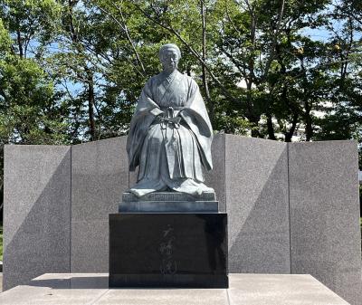 夜散歩で、天文館に向かう際に見つけました。時標(ときしるべ)と名付けられた市内7ヶ所にある薩摩にゆかりのある偉人たちの像の1つです。山形屋百貨店近くのいづろ交差点に設置されており、坂本龍馬が妻のお龍と新婚旅行で薩摩を訪れた姿が再現されています。