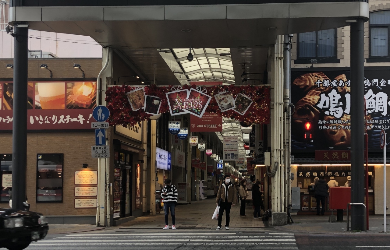 小倉駅から旦過市場まで、続く、アーケードのある商店街です。日本で最初にアーケードができた、発祥の地だそうです。洋服、百均、ドラッグストアなどがずらりと並んでいます。電子クーポンを初めて使うので、お店の方と一緒にやって、何とか使えました。