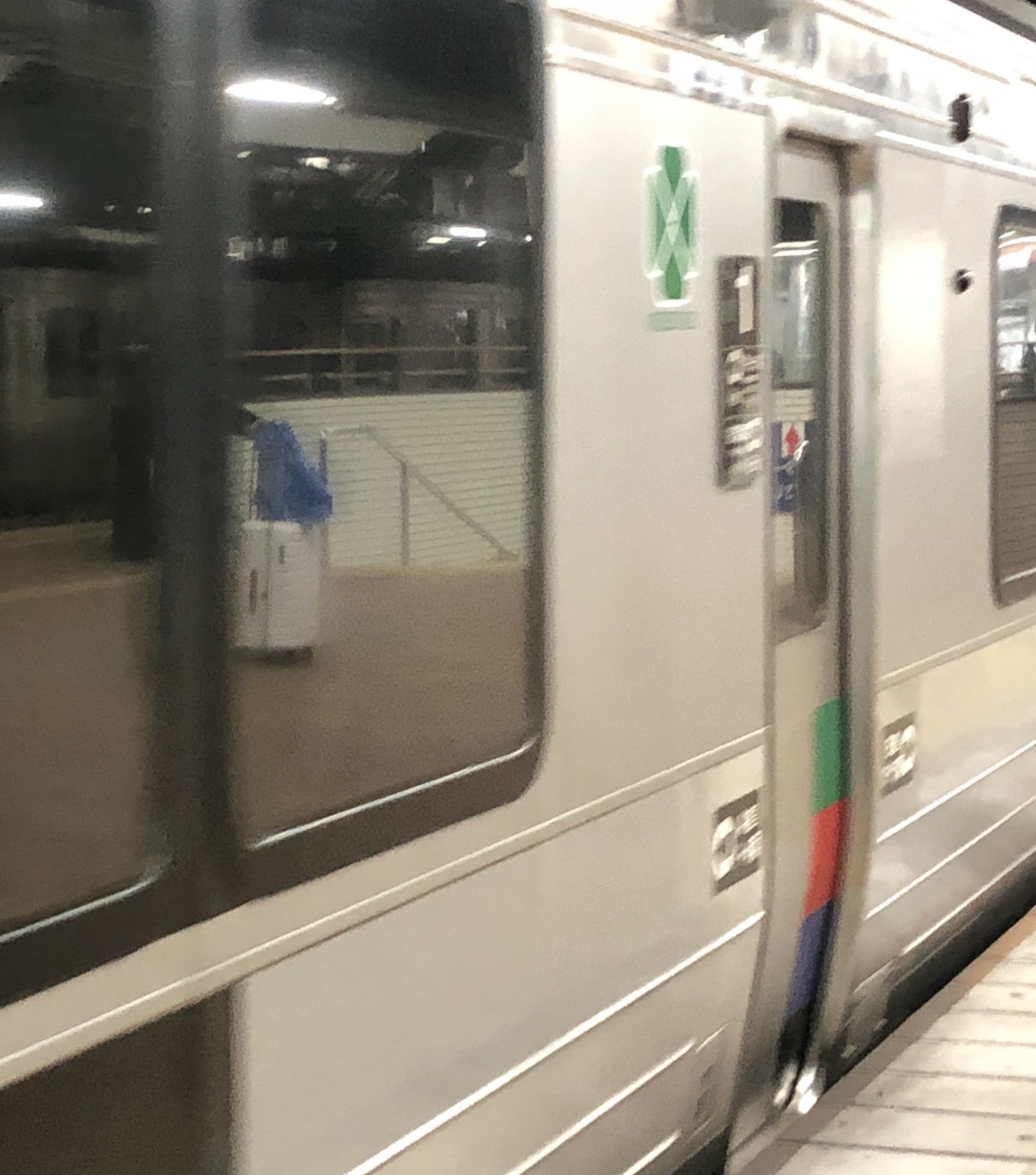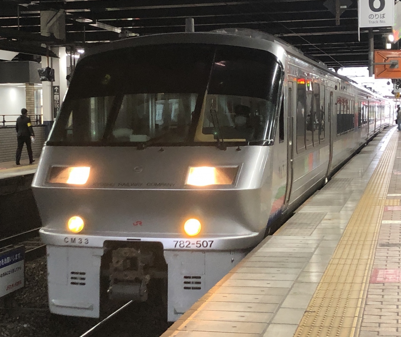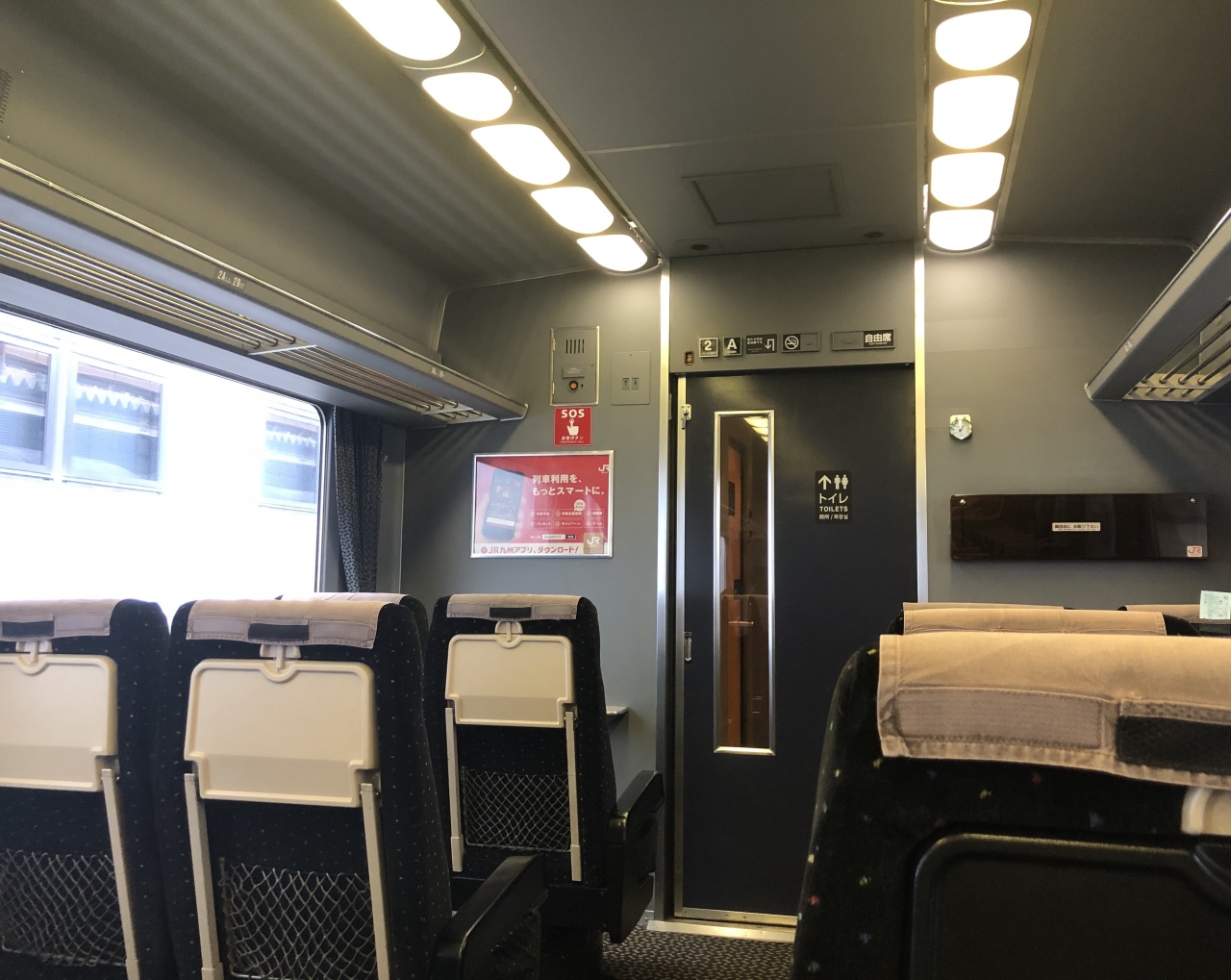 小倉から博多まで乗車しました。痛む膝を抱えて、ゆっくり歩きながら、ソニックに乗るつもりで行ったのですが、早く着きすぎ、一本早いこの「かがやき」に乗れてしまいました。1号車はグリーンと指定、お客は2人。2号車は一人3席利用できるくらいの、避密でした。
