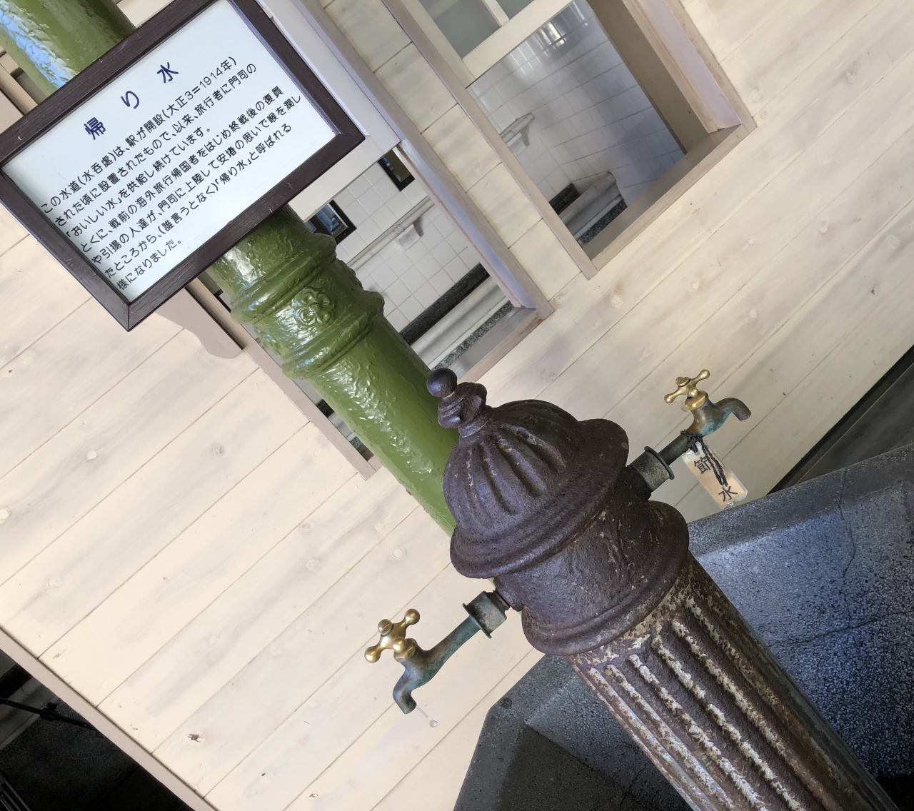 門司港駅の改札を出て直ぐ左側、トイレの前にあります。大正3年(1914年)に駅が開設された頃に設置されたそうです。戦前の海外旅行帰国者をはじめ、終戦後の復員や引き揚げの人達が、門司に上陸して安堵の思いで喉を潤したところから、「帰り水」とよばれるようになったそうです。感慨深いです。