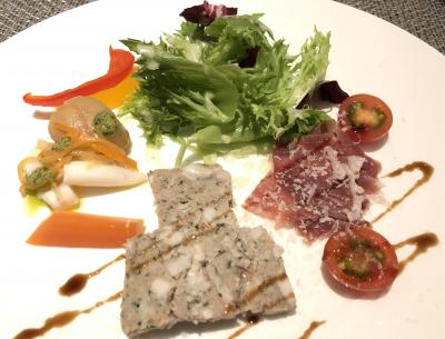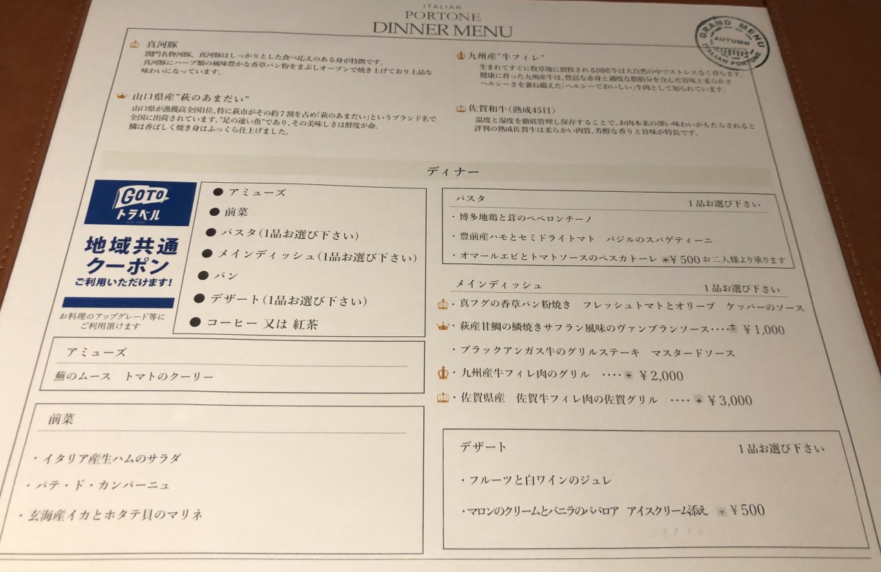 1泊2食付きでプレミア門司港ホテルに宿泊しました。夕食はここでイタリアンのコース。パスタとメインは選べます。食前にアルコールは苦手なので、お茶を頼みました。麦茶を薄めたようなお味。オーダーを厨房に通す声が、客席に丸聞こえ。コースの味は塩味が強めで、そこそこ。食後の紅茶は、ティーパックを5分煮立たせたような味だったので、一口だけ飲んで席を立ちました。