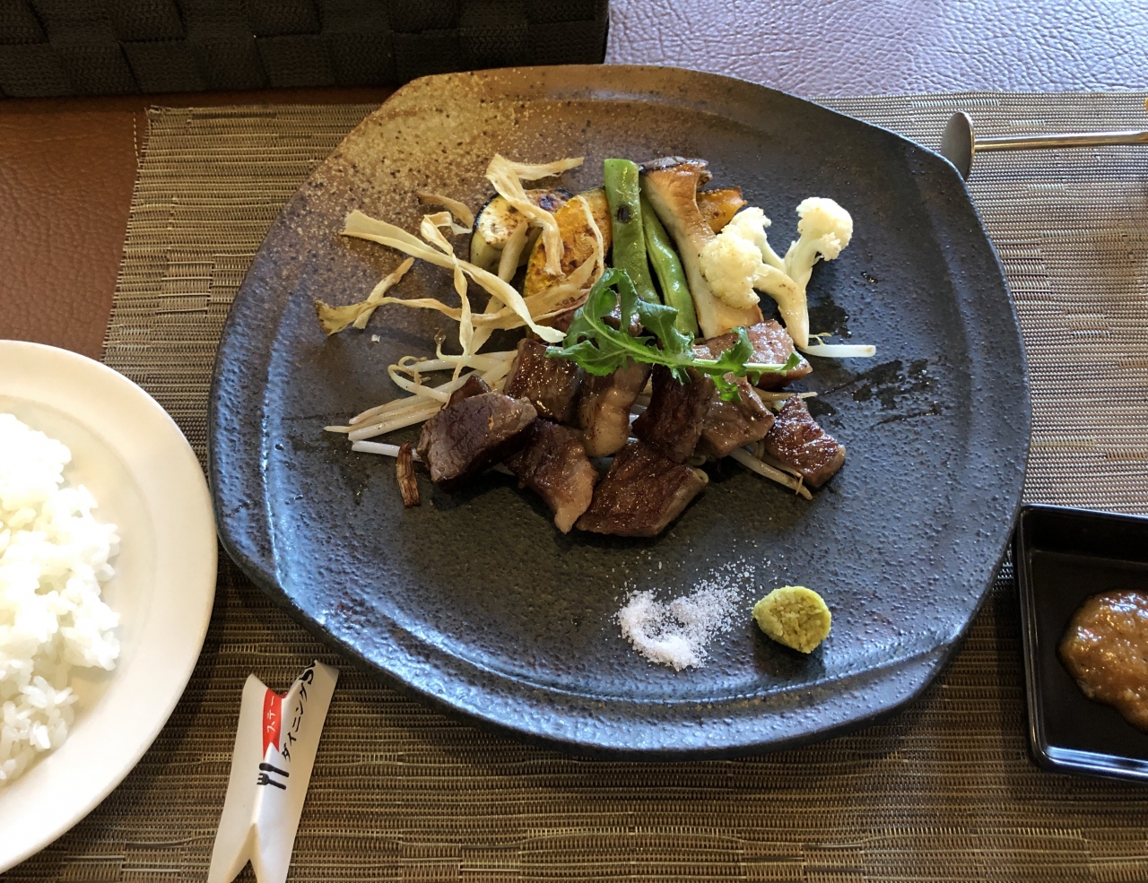 友達とランチを頂きに訪問しました。店の裏手に駐車場が2台分あります。本日のお魚は鮭ということで、二人とも、サイコロステーキにしました。サラダ、しめじのスープ、ステーキ、コーヒーで1628円。美味しかったです。