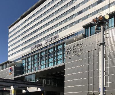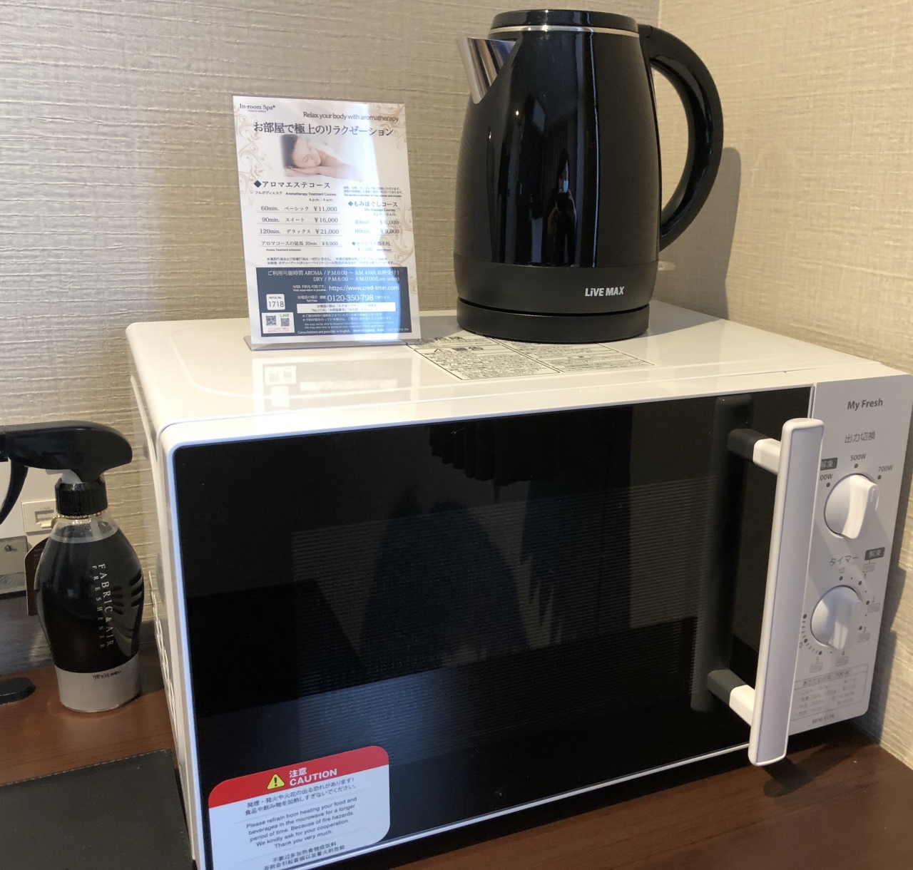 小倉駅ビルを出てから右手に徒歩1分。10月にできたばかりの新しいホテルです。チェックインは機械ででき、カードキーが出てきます。部屋には加湿器つき空気清浄器、電子レンジがついています。窓の下には線路。新幹線も見えます。
