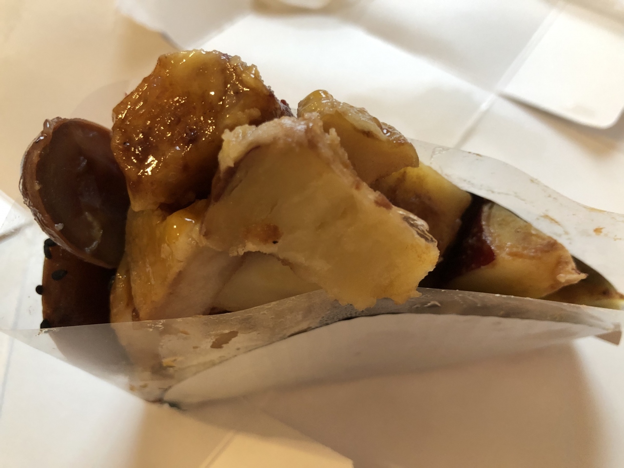 博多阪急地下1階にあるケーキ屋さんです。ここに来たら必ず寄ります。大好きなフルーツタルトはなく、季節のタルト421円にしました。サツマイモ、栗、煮リンゴが乗っていて、これはこれで美味しかったです。フォークと保冷剤も付けてくれます。
