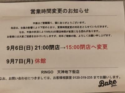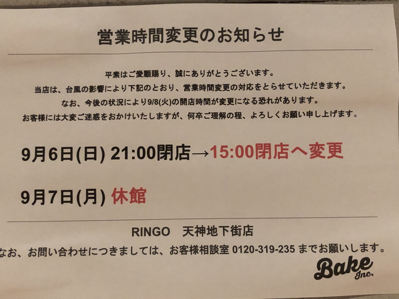 以前はチーズケーキを購入するために、何十分も行列していましたが、最近はそれほどでもありません。早朝、台風10号飛来当日夕方、訪問しました。台風のせいで、天神地下街は全店休業で、ここも休業。シャッターが下りていて、買えませんでした。