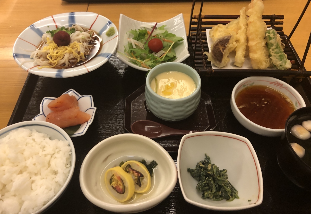 従姉と、平日の昼間、ゆっくりゆったりランチしました。大丸東館エルガーラ6階にある和食のお店です。和定食は、ごはん、吸いもの、天ぷら、刺身、麺、茶わん蒸し、漬物で1400円。食後のソフトドリンク200円。美味しかったです。