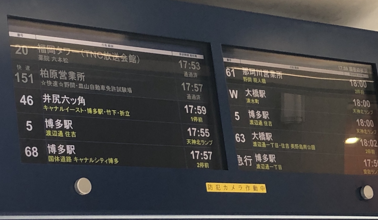 博多駅周辺 いわゆる福岡都心は、100円で乗れるので、大変安くて便利です。バス停に時刻表があるのは当然。大きなバス停には電光掲示板があり、行き先番号と、そのバスの現在地が表示されるので、時間通りにバスが来なくても、イライラせずに待つことができます。