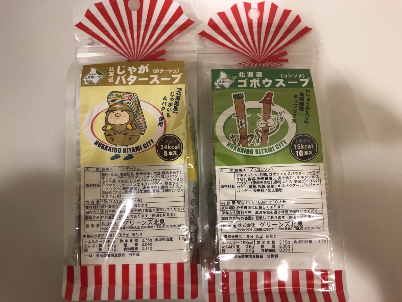 小倉駅が目の前の、大変便利なI’mの地階にある、北海道のアンテナショップです。お気に入りは「じゃがバタースープ」356円。スティックタイプの粉のスープが、8本入っています。お手軽、濃厚で美味しいです。ごぼうスープ、オニオンスープもあります。