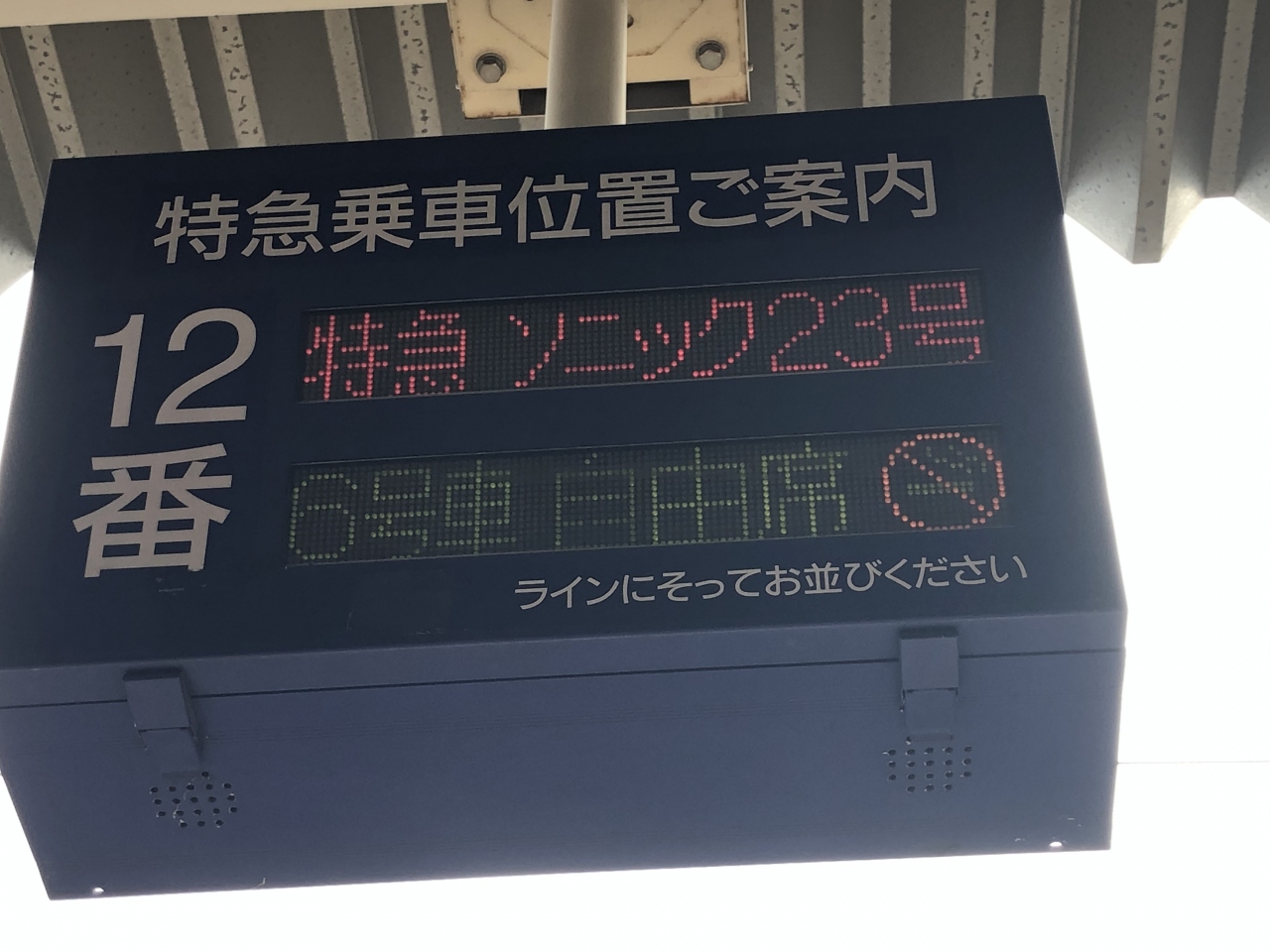 博多~小倉間を往復利用しました。ネット予約だと1470円。窓口だと1830円なので、ネット予約がお勧めです。青と白のソニックが走っていて、博多~小倉間葉40分ほどです。6号車にはキャリー置き場があります。