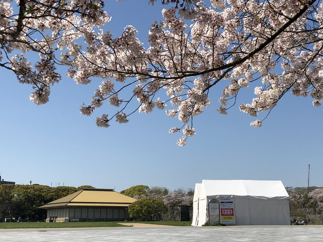 一人でお花見に来ました。天神からバスに乗車し、美術館東口で下車し、ぶらぶらと歩きました。掲揚塔があったので、学校だろうと思い、近づきました。有料駐車場って???と思いながら。以前は舞鶴中学校でしたが、今は3の丸スクエアと言う名の鴻臚館案内所に変わって居ます。甘味処、休憩所となっています。