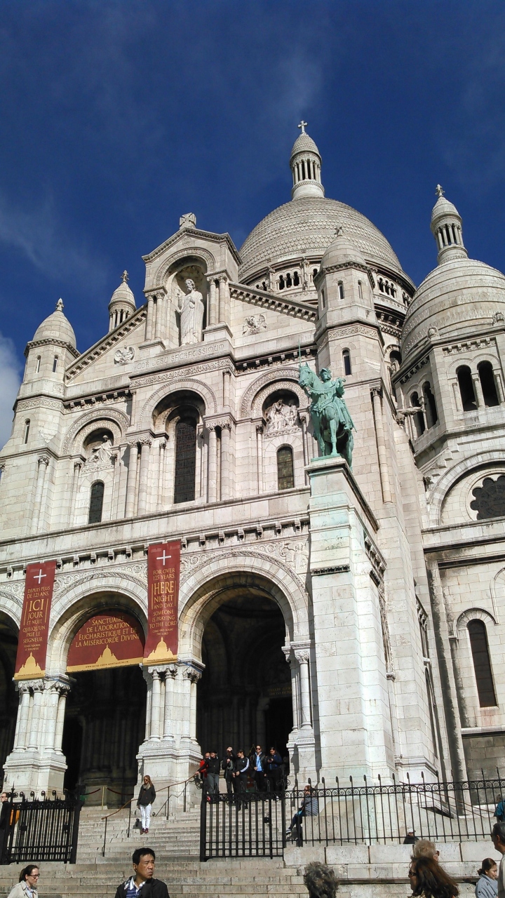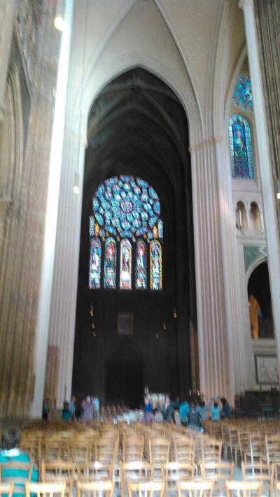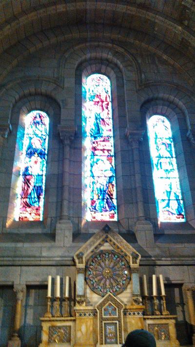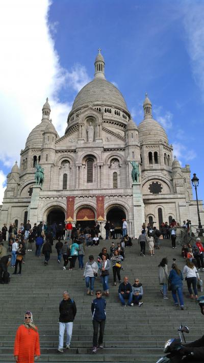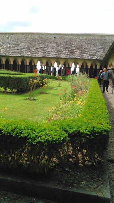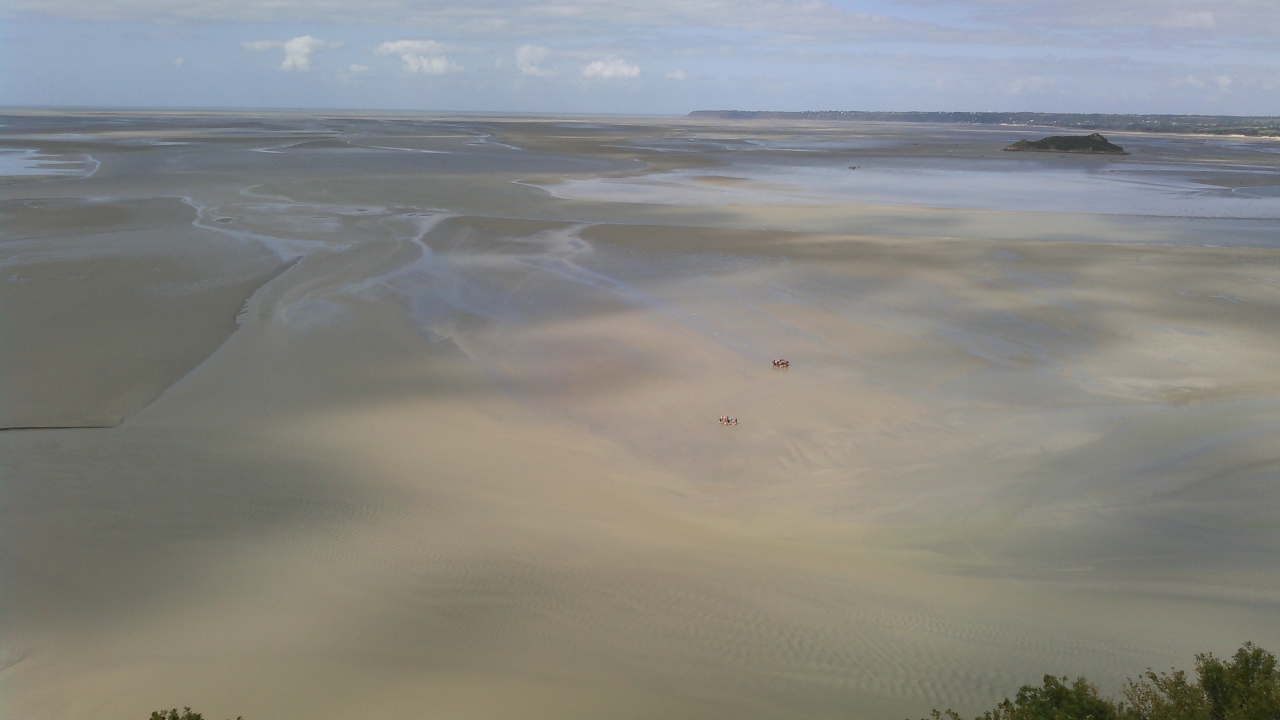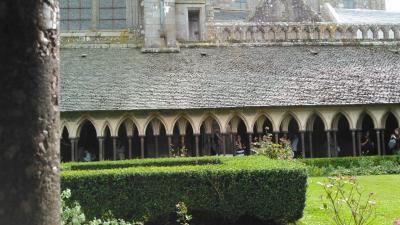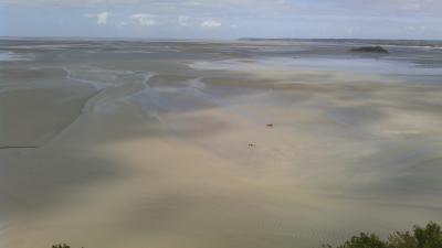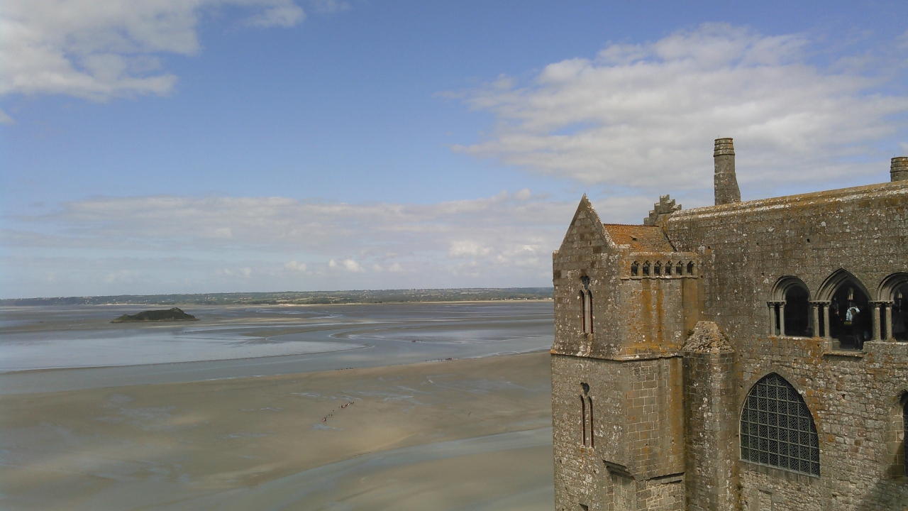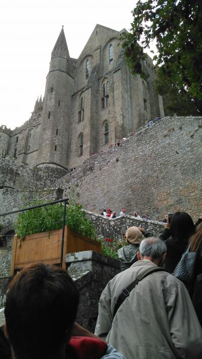 ツアーで上から眺めました。引き潮で、砂地が歩けるようになっていて、そういったツアーもあるようでした。モンサンミッシェルは遠くから眺めると大きな岩山のようですが、島で、シャトルバスに乗って移動しました。