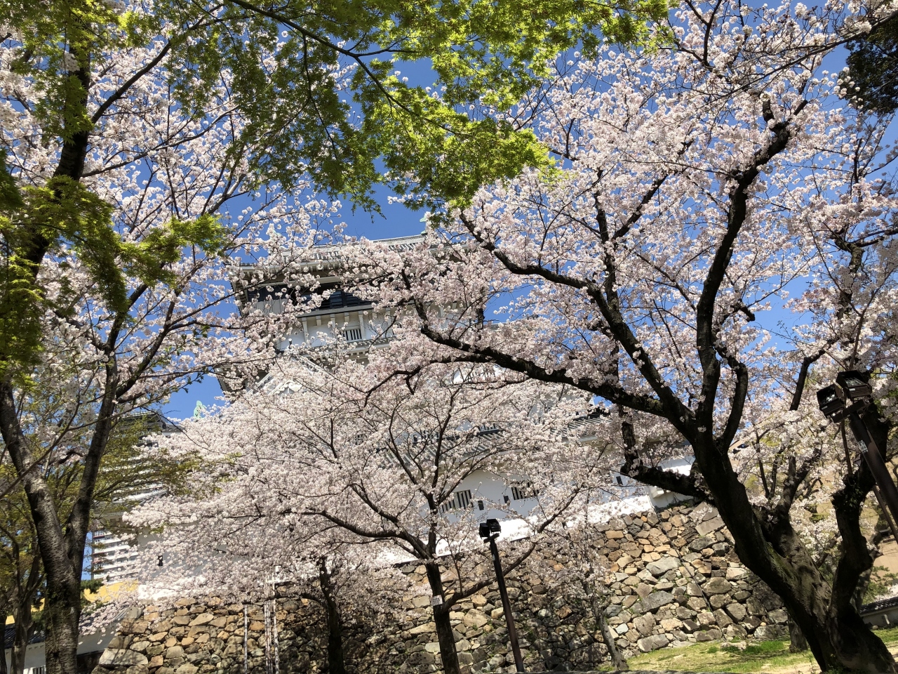 ご時世で、中へは入れません。が、お店の中のトイレは使えるようになっていて、大変新しく清潔でした。お城の周りの桜が満開で、見頃でした。何種類もの桜が咲いていました。桜のピンク、お城の白、青もみじの緑、青空の青がコラボして大変美しかったです。