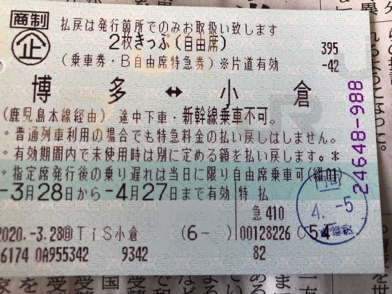 小倉から博多まで乗車しました。特急乗車券は前日に金券ショップで1450円で購入。同じ料金の「ソニック」は、大分からで、停車駅が少ないので、乗客が多いだろうと思い、小倉~博多間の「きらめき」なら、空いているだろうと思って乗車しました。同じ車両に乗客は4人でした。