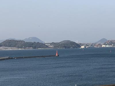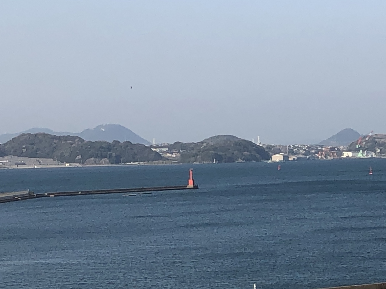 ホテルから遠くに関門大橋が見えました。人道と、車道があります。本州の下関と、九州の門司を結ぶ白く大きい橋で、橋の上からだと、風向きを示す柱や、行き交う船などを眺めることができます。青い海と、白い橋と、船と、遠くから見ても絵になる風景です。
