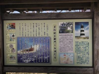 勝山公園を桜見物しながら歩いていて見つけました。何だろうと近づいて見たら、櫓のようでした。良く読んでみると、岩松翁という人が、難所に、自費で、白洲灯台を建てた偉業を