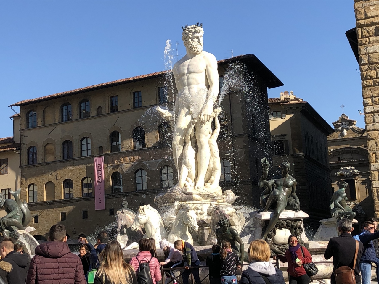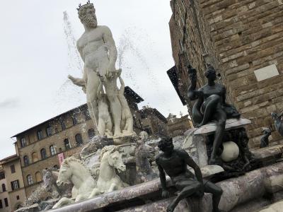 ツアーで見学し、自由時間に一人で訪問しました。シニョーリア広場にある、白く大きなネプチューンが立つ噴水群です。アンマンナーテイによって造られました。ヴェッキオ宮の赤茶色を背景としているので、白さがひときわひきたちます。