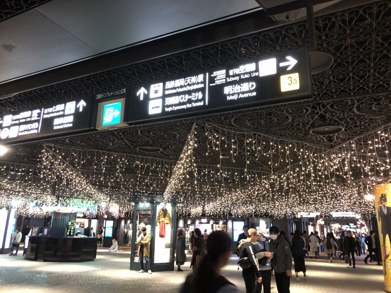 小倉駅から徒歩8分、北九州の老舗デパートです。私の子供の頃から営業しており、他店が撤退する中、現在までなお営業を続けています。旧館と新館がありその間は通り抜けができます。季節がら綺麗なクリスマス仕様の飾りがあり、母子連れが写真を撮っていました。
