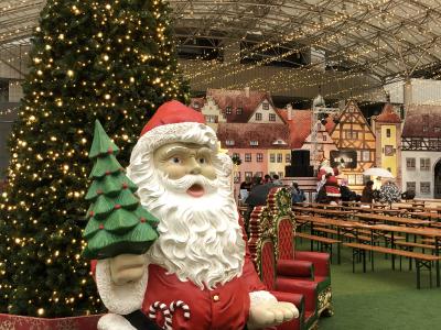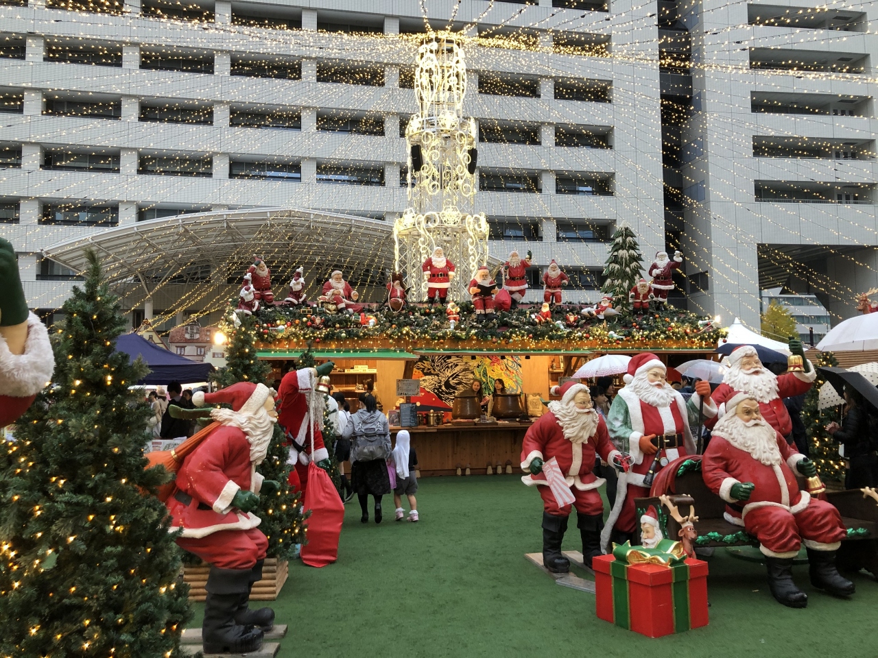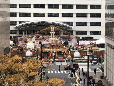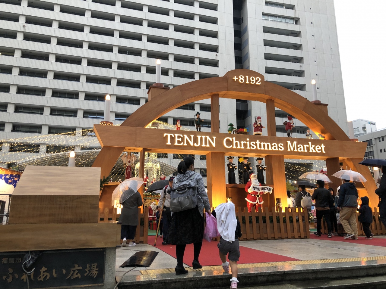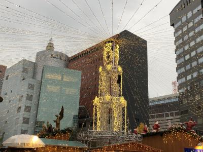 福岡市役所前の広場です。今の季節はクリスマスマーケット。ステージあり、ホットワイン、ホットチョコ等の飲みものあり、ソーセージなどの食べものあり、オーナメントあり。雨で人が少なかったのがちょっと残念でした。