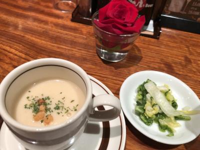 平日の11:30過ぎに訪問しました。銀座インズ1の地下にあるお店です。正午すぎると混んで待つので、早目がお勧めです。テーブルにはいつも赤いバラが一輪。ミニスープと漬物、ライス。ホクホクのガーリックと玉ねぎ、人参とほうれん草、一口ステーキ。炎をあげて焼いているのも、カウンター越しに見えます。男性店員さん達がきびきびと働いている姿も好感が持てます。