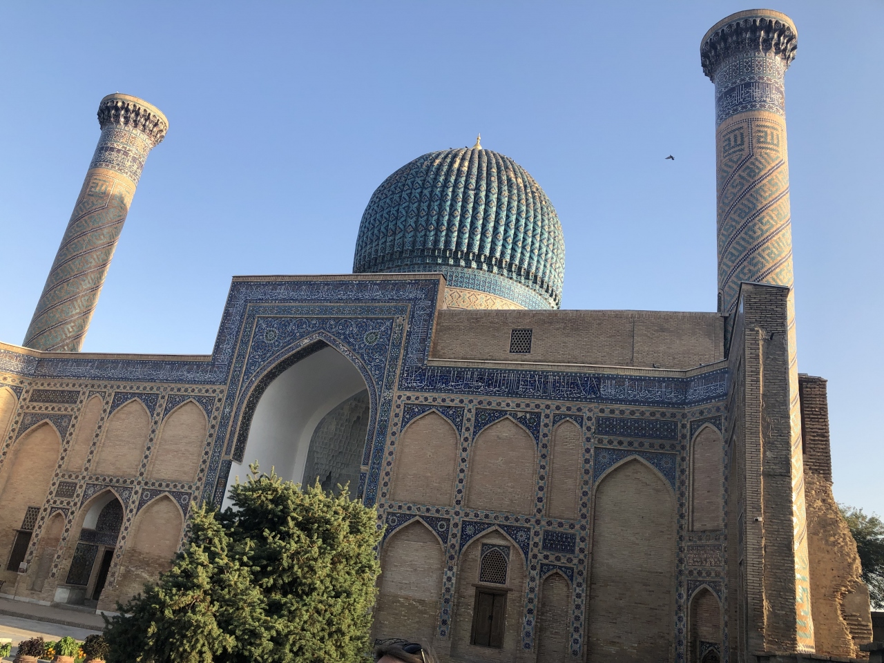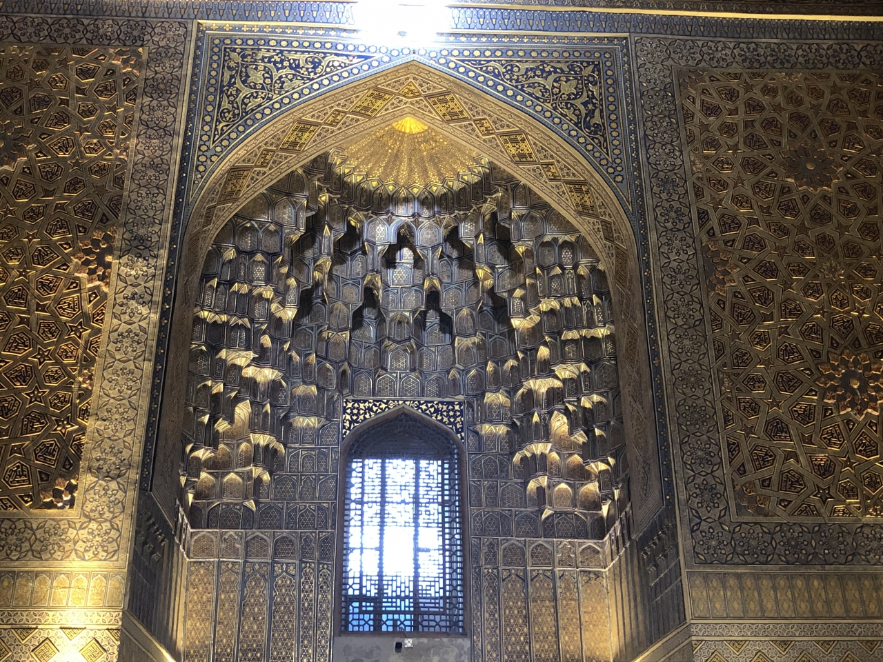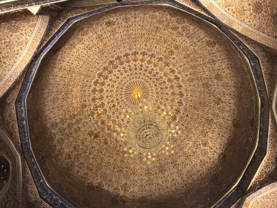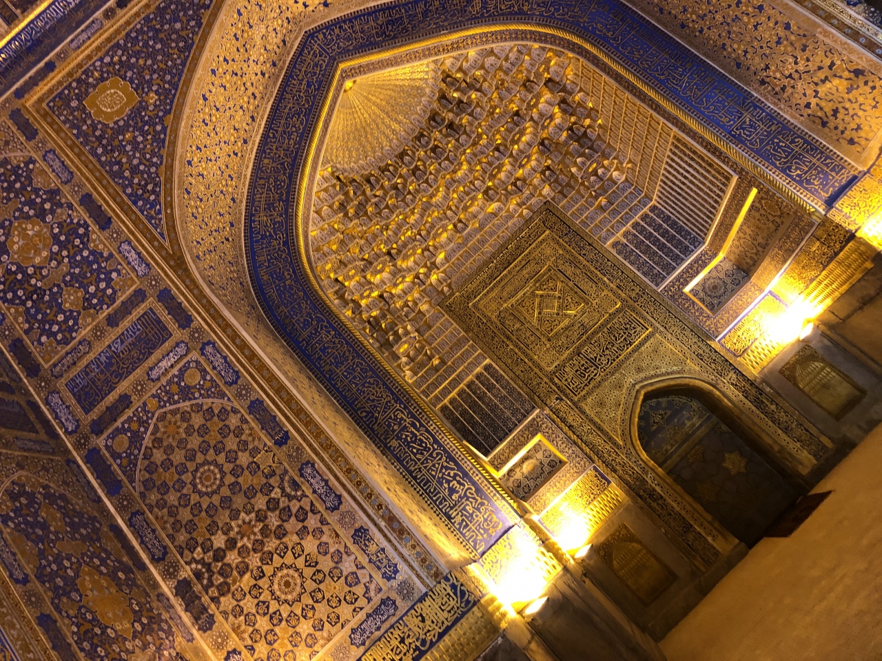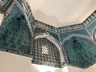 ツアーで訪問しました。グルアミールと言われています。タジク語で「支配者の墓」と言う意味です。ティムールや彼の息子、恩師、孫(ウルグベクを含む)が眠っています。1941年に学者たちが亡骸を出し、ティムール本人と確認されたそうです。さすが支配者。金の使い方が半端なく豪華な廟です。