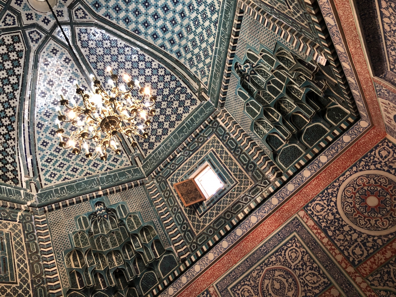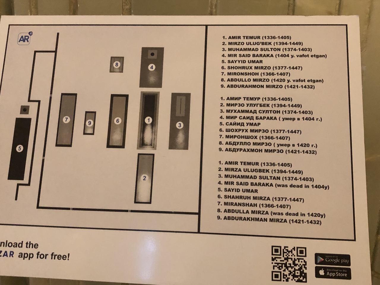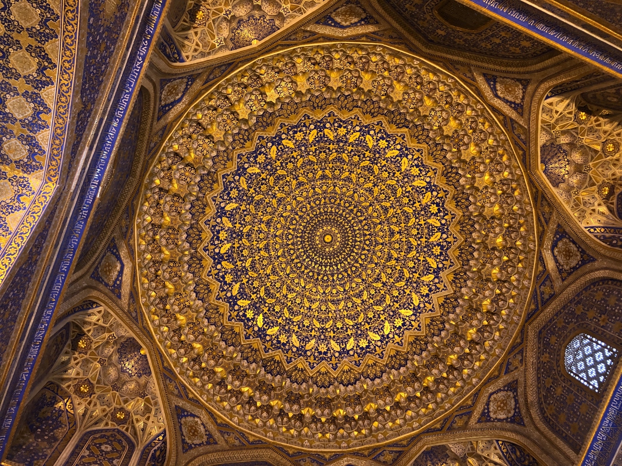 ツアーで訪問しました。グルアミールと言われています。タジク語で「支配者の墓」と言う意味です。ティムールや彼の息子、恩師、孫(ウルグベクを含む)が眠っています。1941年に学者たちが亡骸を出し、ティムール本人と確認されたそうです。さすが支配者。金の使い方が半端なく豪華な廟です。