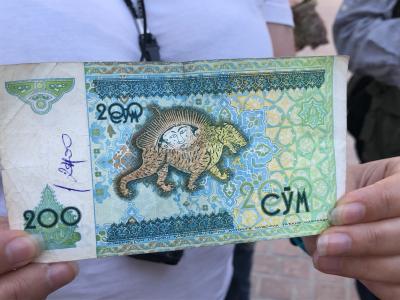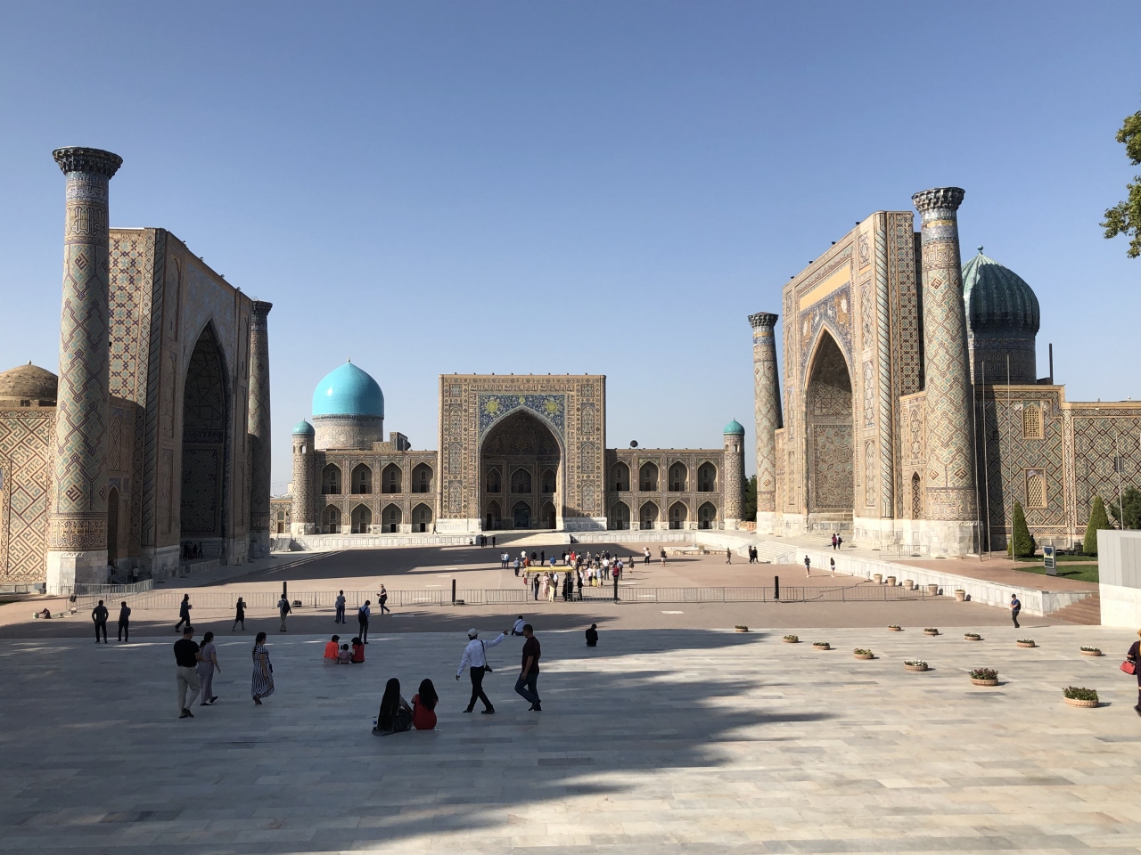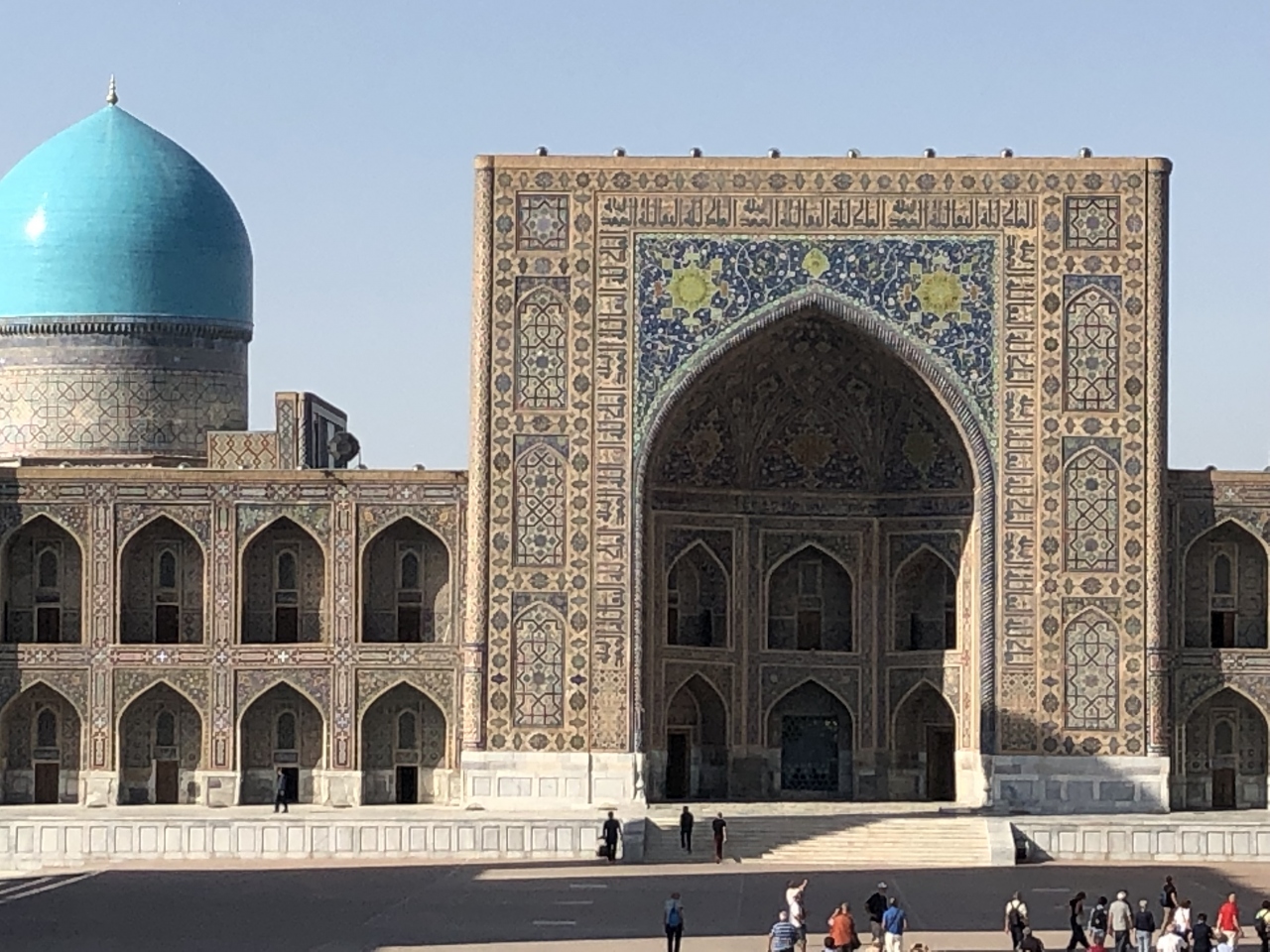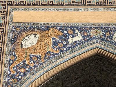 ツアーで訪問しました。広場を挟んでウルグベクメドレセと向かい合っています。「シェルドル」とはライオンが描かれたと言う意味だそうで、入口アーチに、ライオンが鹿を追っている様子と人の顔が日輪を背にしています。イスラムのタブーを破っているのが面白いです。