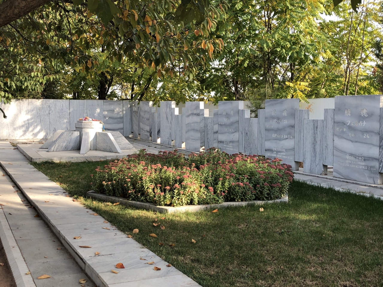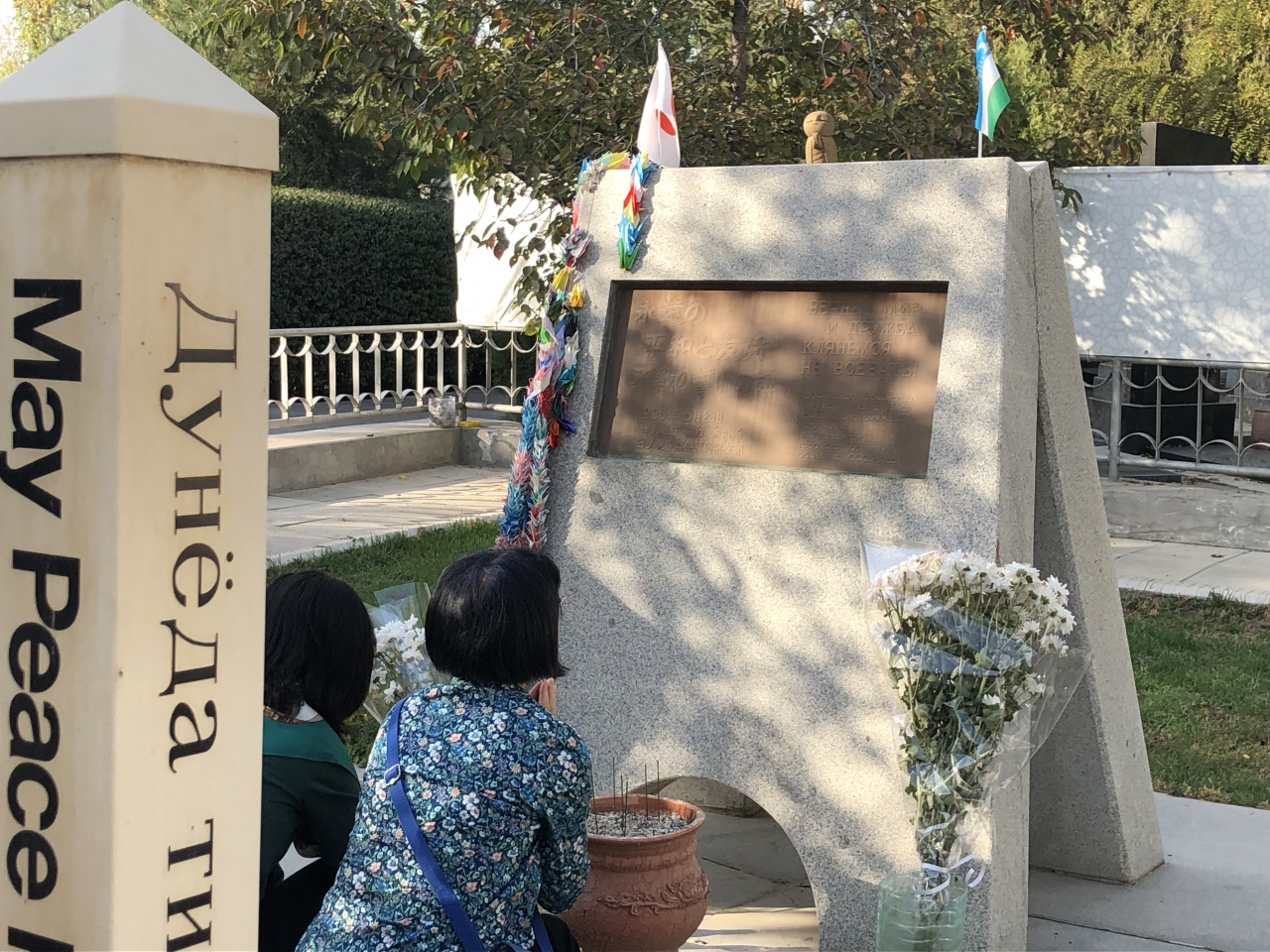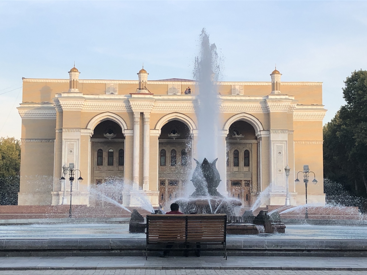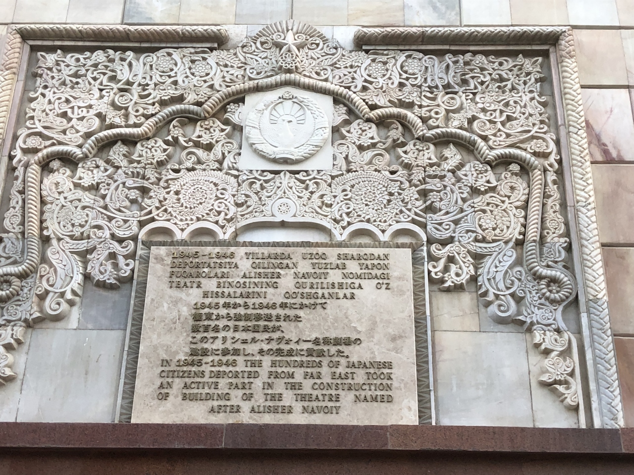 ツアーで訪問しました。満州で抑留され、この地へ連行された旧日本兵457人と、ウズベキスタンの人たちが造りました。20年後、直下型大型地震が起きた際にも絶え抜いたそうです。プレートには日本語でそれが描かれています。綿花の花をモチーフとした噴水が建物の前にあがっていて、涼し気です。