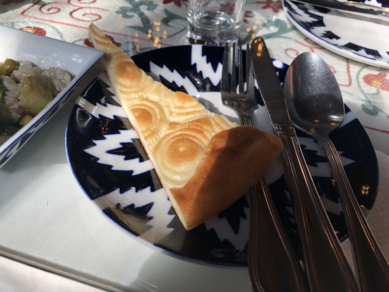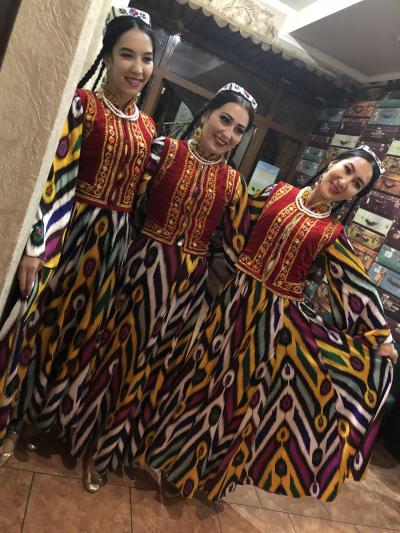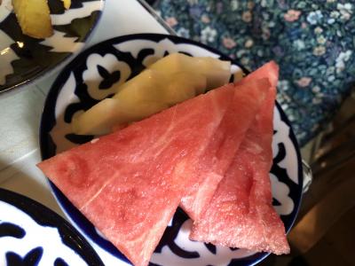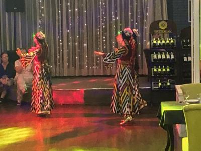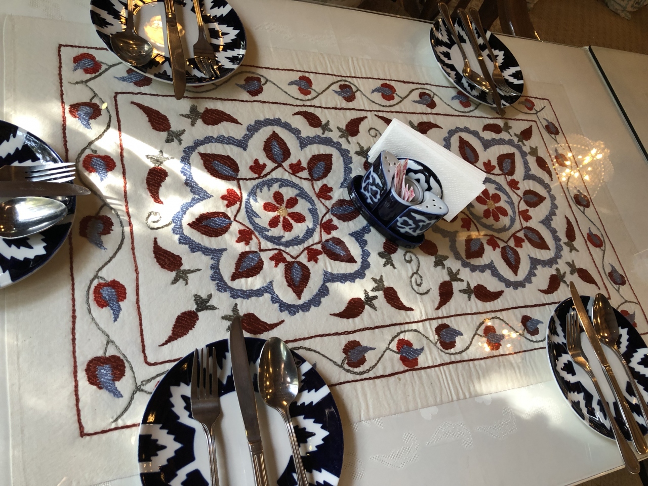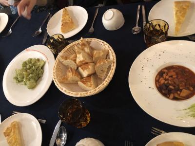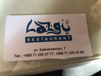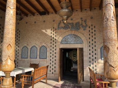 おそめのツアーランチで訪問しました。スポーツセンター内、向かいにあります。他のお客が帰ってしまったので、各テーブルを見ると、スザニのテーブルクロスがかかっていました。内装もお洒落です。メニューはスープ(マンパール)、牛肉の炭火焼き、スイカと瓜。お肉が柔らかく美味しかったです。