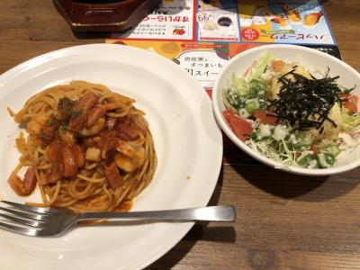 JR利用の従妹と待ち合わせし、一緒に夕食を食べました。小倉駅のデッキと直結しており、大変便利が良いです。お腹の空き具合が違ったので、メニューの多いここを選びました。私はエビトマトスパの小とサラダ、ドリンクバー。彼女はオムライスセットとドリンクバー。それぞれ1200円程度で、美味しくおしゃべりを楽しみました。