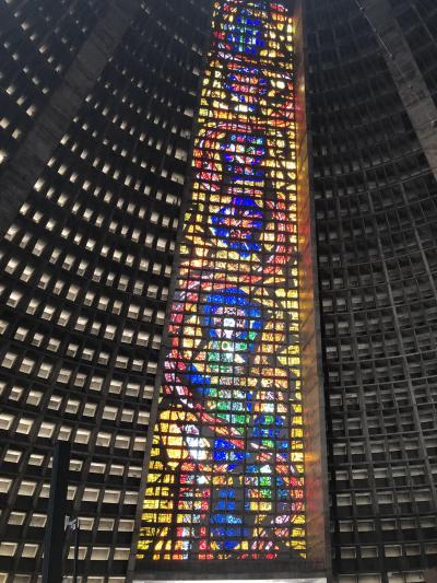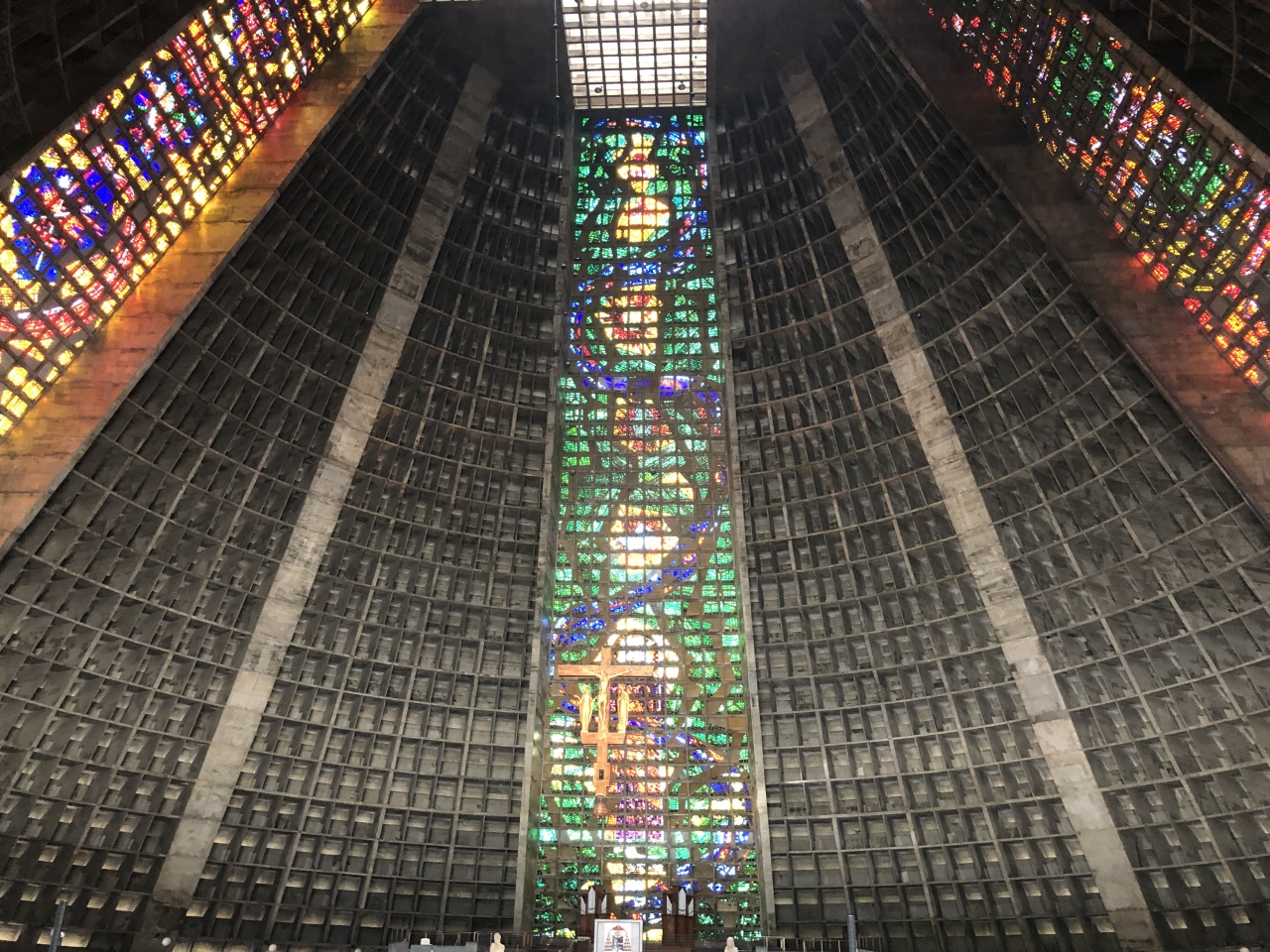 ツアーで訪問しました。ピラミッドのような、円錐型の上部を切り取った形で、高さは80mあります。上部から地面までのステンドグラスが3枚。それぞれ色が違っていて、美しいです。空中に十字架がぶら下がっています。