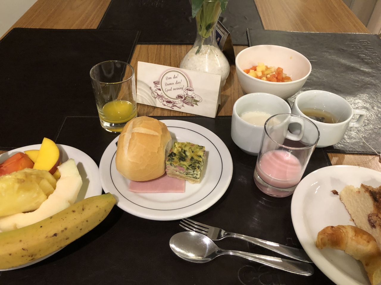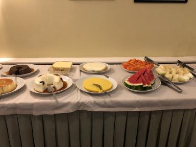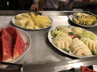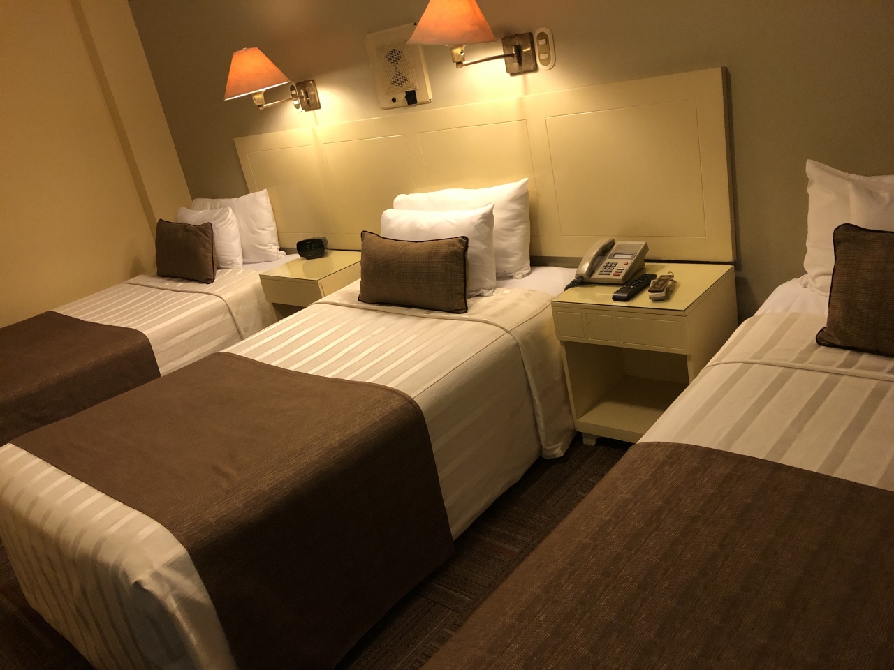 ツアーで宿泊しました。部屋はツイン。シャワーとトイレ、ビデがありました。キャリーを広げるのに十分な広さがありました。食事は、夜も朝もブッフェで、味は普通。フルーツが多く嬉しかったです。近くにスーパーがあり、買い物に便利でした。