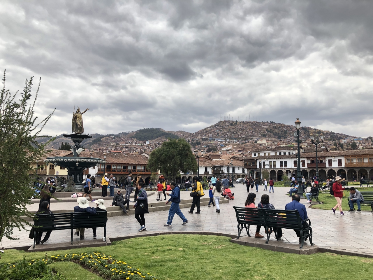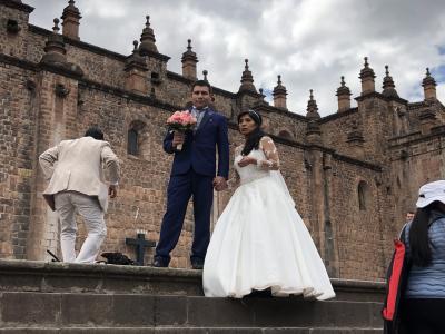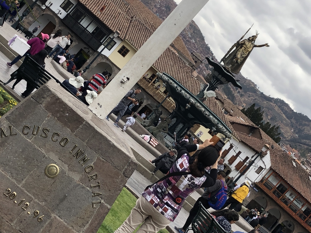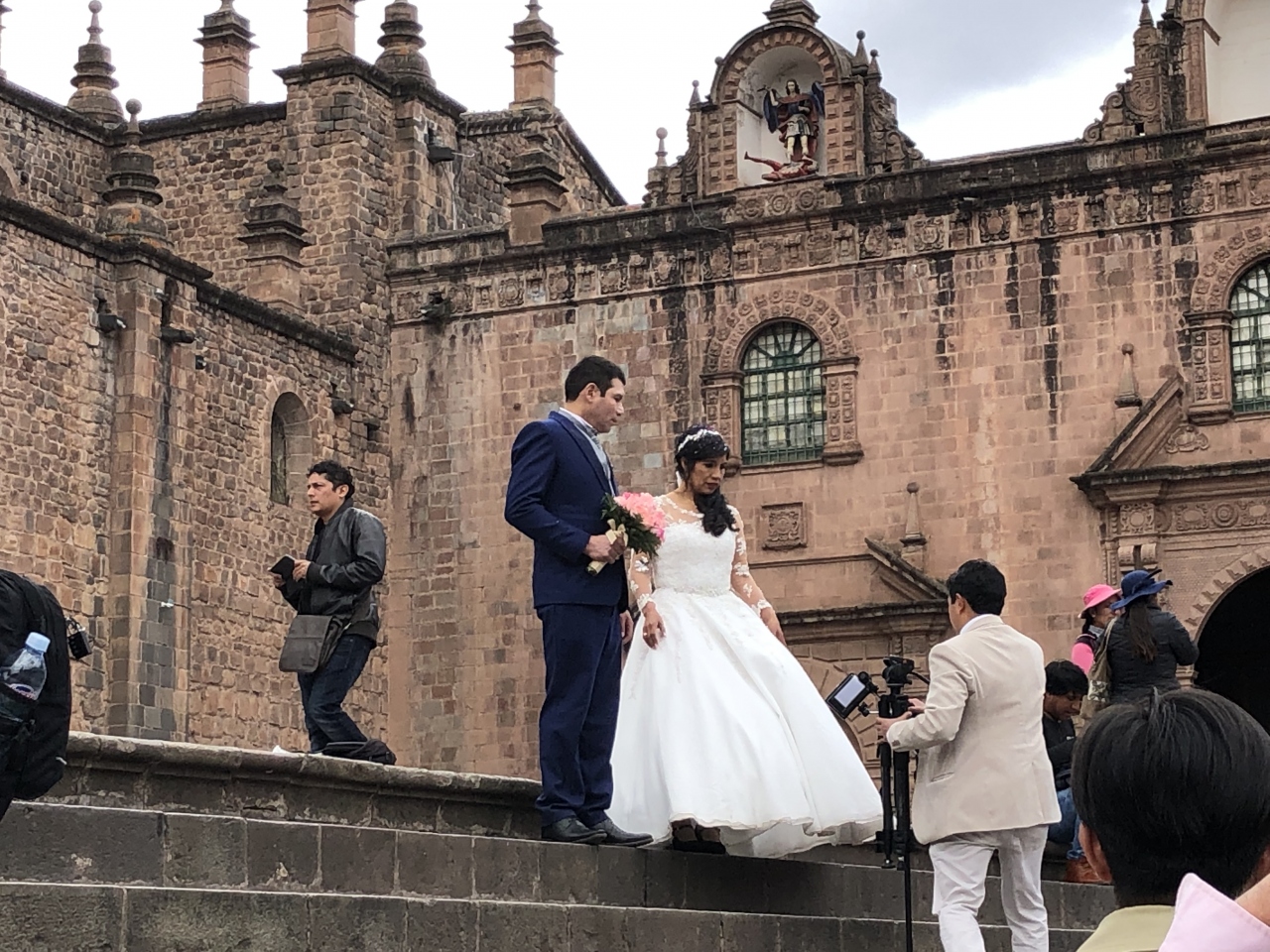 ツアーで訪問しました。クスコ観光の中心地です。インカ第9代皇帝のバチャクティの噴水があがっています。その周りにはクスコのシンボル赤茶色のカテドラル。たまたま結婚式があり、新郎新婦がいました。ラコンバニーアデヘスス教会、レストラン、お土産物屋などがあります。歴史を感じます。