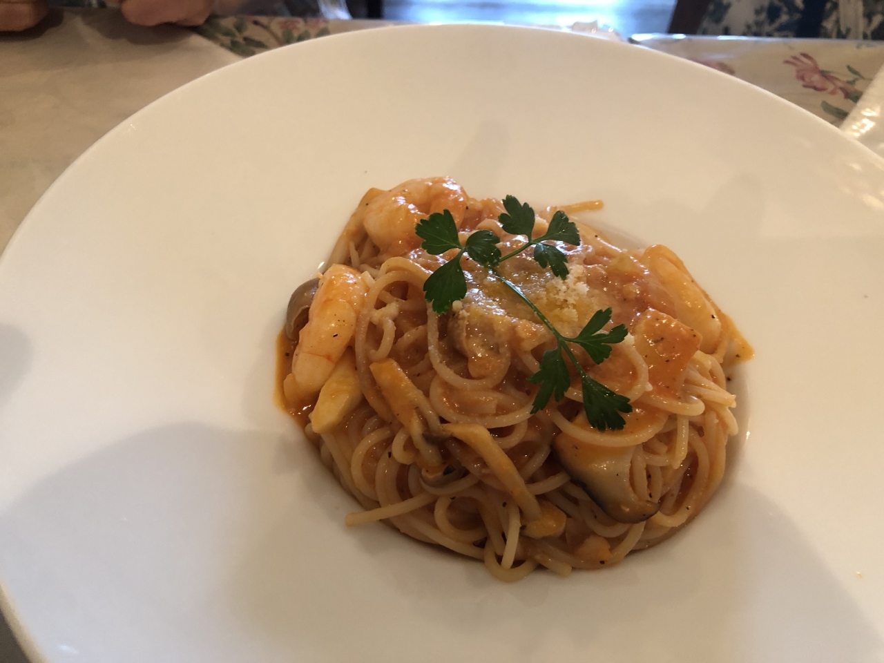 検見川浜駅から徒歩14分。住宅街の一角にあります。駐車場は2台あります。元同僚の先輩と、平日に初訪問ランチしました。パスタランチメニューは980円で3択。エビトマトクリームソース、ツナきのこクリームソース、ペペロンチーノ。サラダ、スープ、ドリンク付。200円でティラミスか、リンゴのシブーストが付きます。味はそこそこ。貸し切りでした。