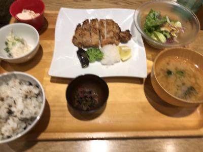 お盆休みのランチで訪問しました。混んでいると思い、時間をずらして14時少し前に。今回はお肉ランチ。ひじきご飯とみそ汁はお代わり自由。漬物、豚肉のみそ漬け、ミニサラダ、冷ややっこ。いろいろと食べられて美味しかったです。