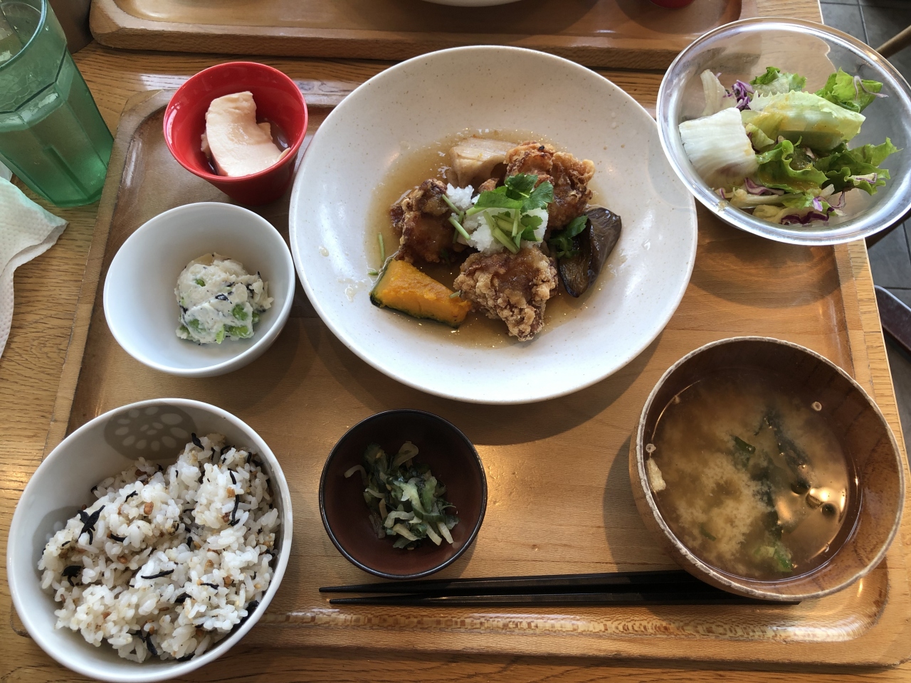 東京国立博物館の帰りに友達とランチしに寄りました。上野駅の目の前、さくらテラスの2階にあります。ご飯、みそ汁はお代わり自由。今回はお肉定食、1080円。から揚げ霙かけ、枝豆ポテトサラダ、冷ややっこ、漬物。栄養バランスが良く美味しいです。